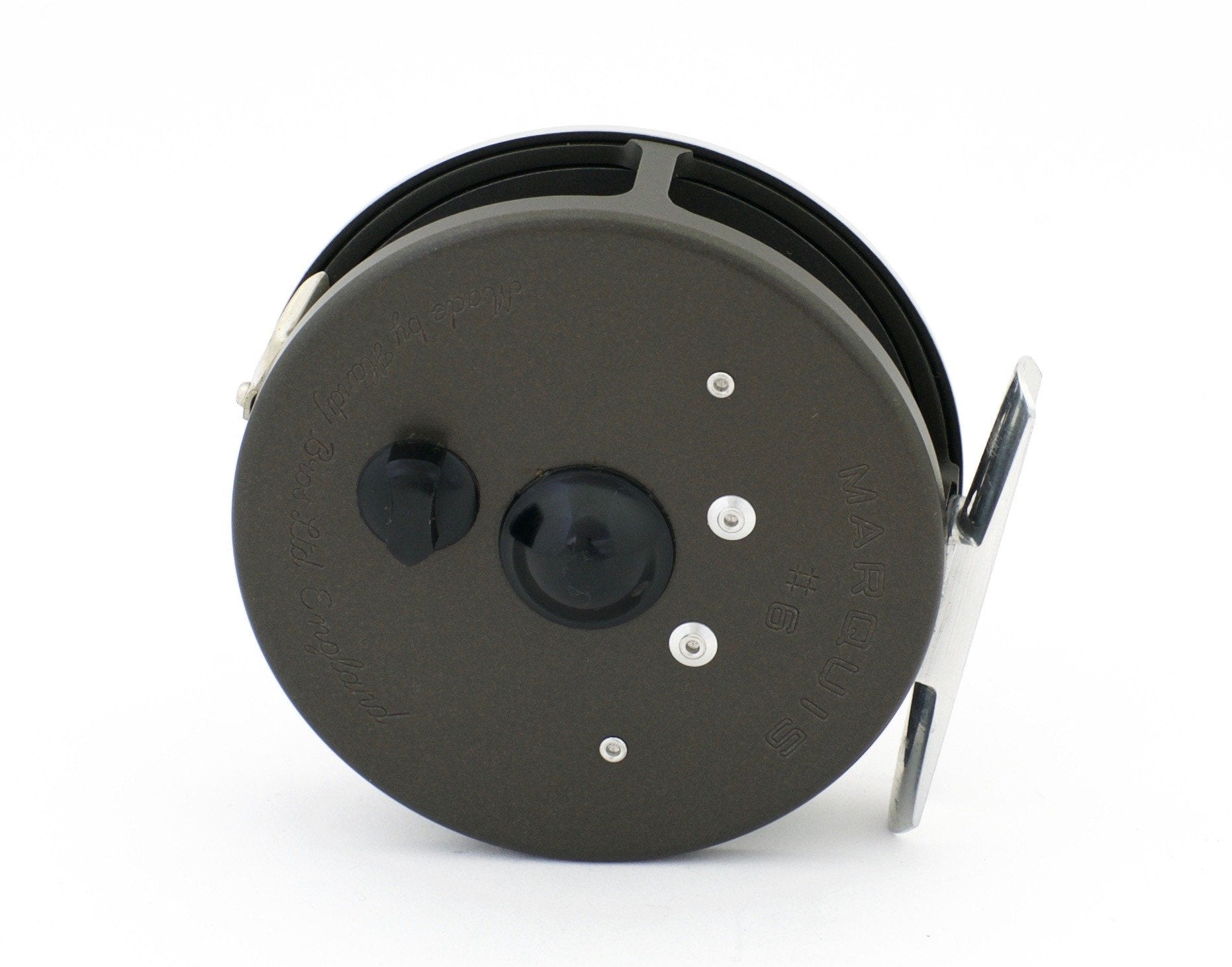 For sale here is a Hardy Marquis 6 fly reel and spare spool. Excellent used condition. The spare spool is in near mint ++ condition. Included are the reel pouches shown in the photos. Set up for right hand retrieve, but can be switched easily to left. Capacity is up to a WF7+75 or DT7+50. The Marquis series is ever-growing in popularity due to the combination of the classic click/pawl design plus the palmable spool feature.