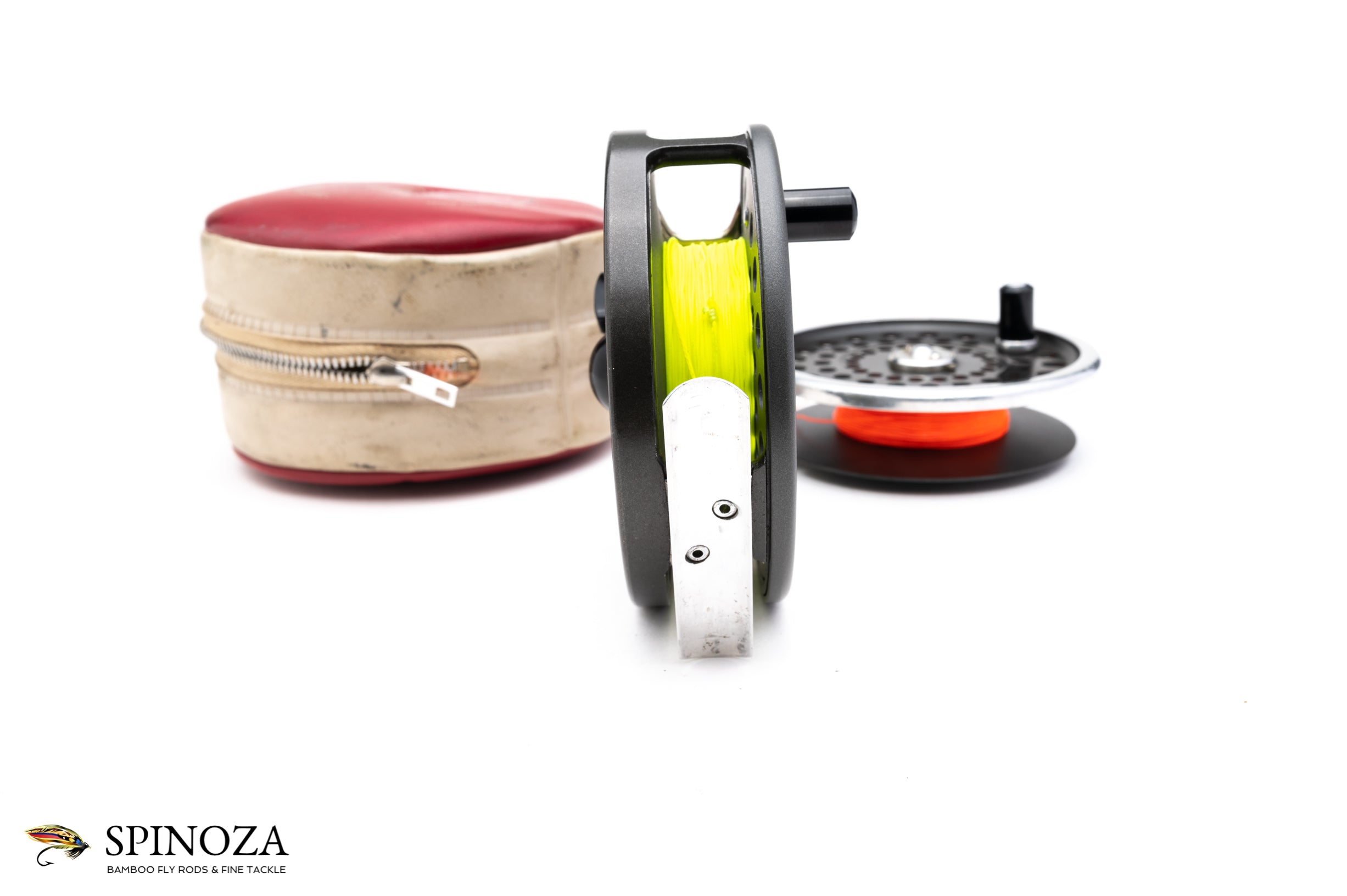 A Hardy Marquis 8/9 fly reel with a spare spool, 3 5/8" diameter and currently set up for RHW, though easily reversible. Good used condition with minor cosmetic wear throughout. The loaded spool is a matte finish while the spare spool has the bright rim edge (both are loaded with backing). Reversible nickel silver line guard. The reel has a capacity of WF8F and 100 yards 18# dacron backing. Comes with original Hardy cream and red reel case.