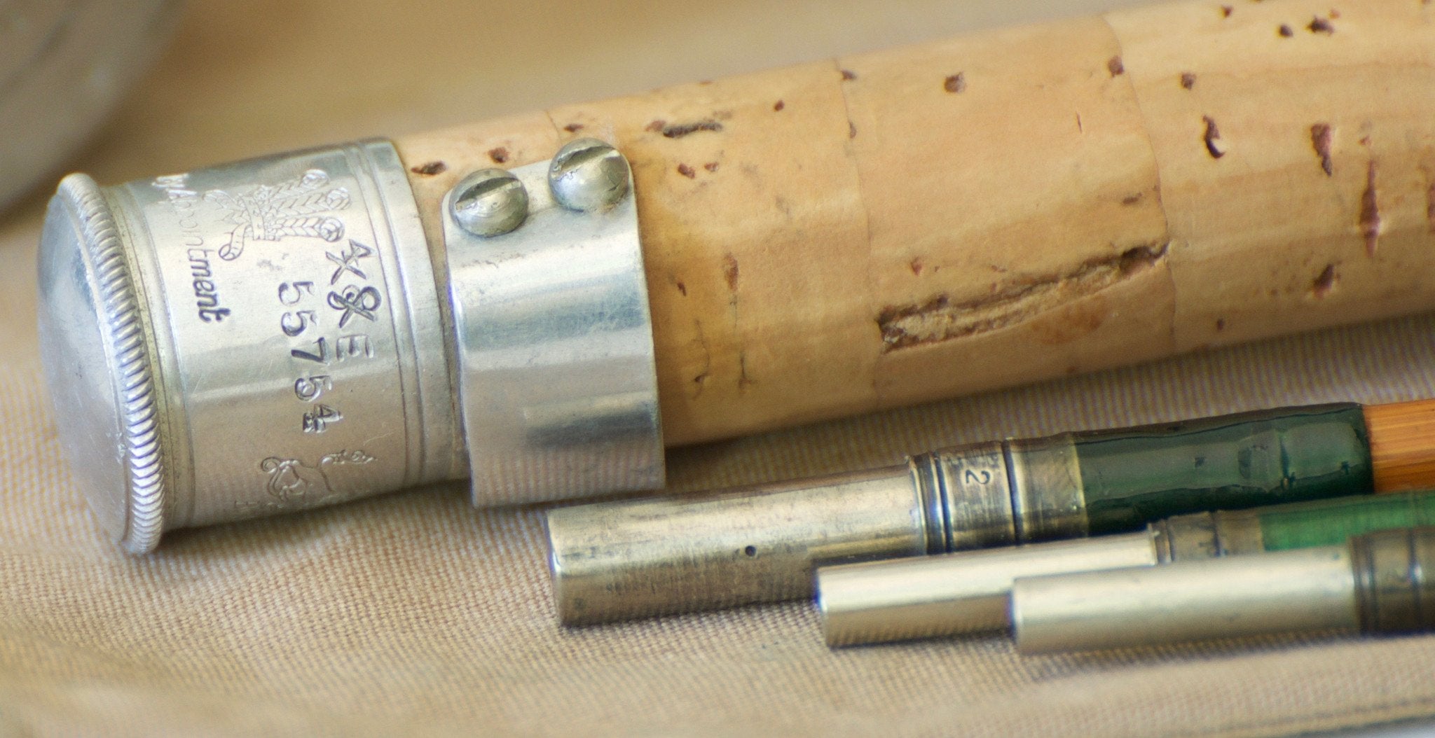 For sale here is a Hardy Marvel bamboo fly rod - 7'6" 3/2 for a 4 weight line. The rod is in excellent original condition with the exception of the mid male ferrule being re-wrapped in a darker green thread. All sections are full length and straight. Serial number E55754, the rod was made in 1942. Golden silks on the guides and classic Hardy green at the ferrules, tip-tops, and winding check. The varnish is in great condition with a few very small chips throughout the rod. Full Wells grip very clean and in excellent shape. Aluminum down-locking Hardy style cap and ring reel seat over a cork spacer. Blued, English reverse twist guides. Agate stripping guide. Blued ferrules size 14/64 and 9/64. The fit is excellent and pop when separated. In addition to lovely wood topped cork ferrule plugs the rod comes with male ferrule covers. The a bright aluminum and lined with cork to ensure a better fit and more protection. Medium-fast action that is very smooth and quite nice. The rod weighs 2.95 oz. Includes replacement bag and original tube.