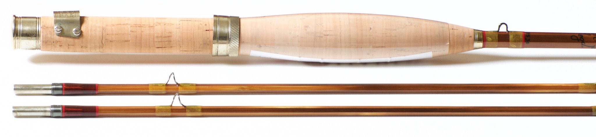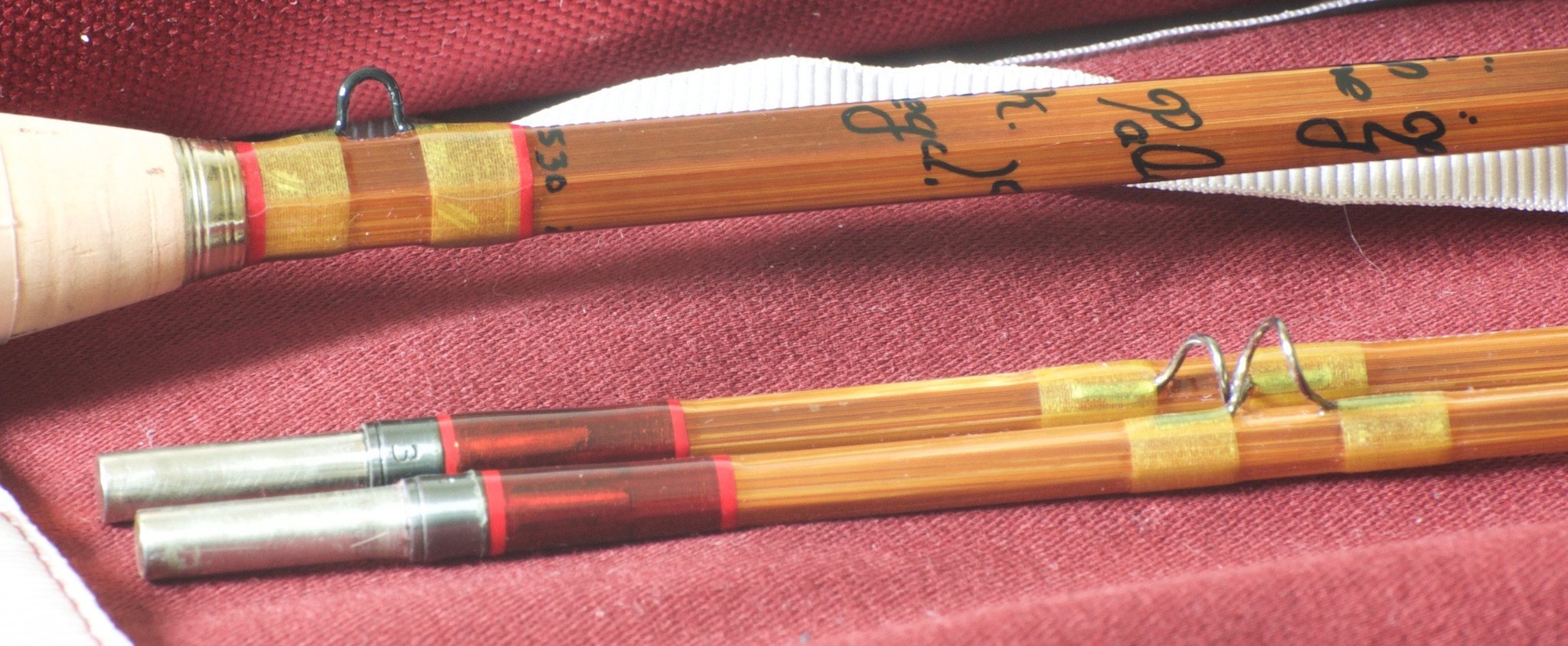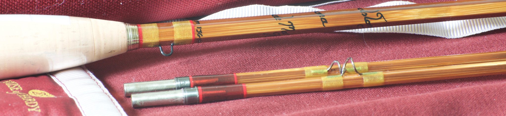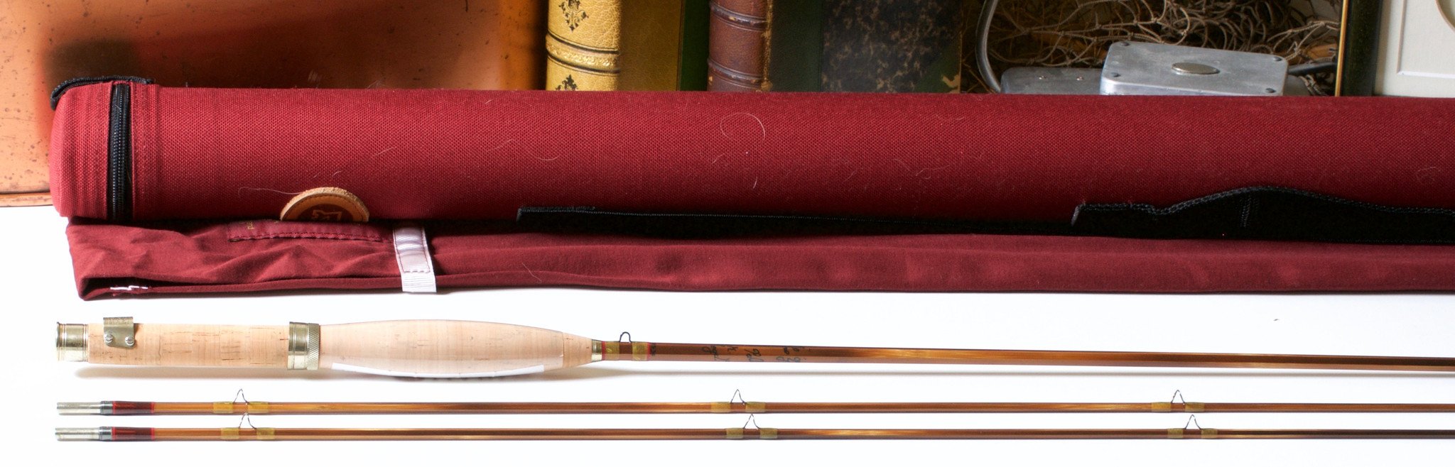 For sale here is an amazing Hardy Palakona "Gladstone" bamboo rod, handmade in Alnwick, England by Calum Gladstone. This one is 7 feet in length, two sections with two tips for a four weight line. Unused condition - "near mint" overall. Beautifully flamed and varnished cane with striking golden nodes. Light yellow / lime silks with red edges at the hook keeper, stripping guide, ferrules, and tip tops. German silver cap and ring over all-cork reel seat. The rod weighs 3 5/8 oz. The ferrules are size 13/64 and fit together nice and tightly. Very authoritative medium fast action. Comes with an original three-compartment Hardy bag (with ferrule plug pocket) and original cordura Hardy rod tube. The rod was initially delivered in 2006 as a one-tip rod and the owner had Mr. Gladstone make another tip for the rod in 2007. There is a very slight difference in the lengths of the two tips (approx. 1/16"), but the ferrule fit is perfectly tight on both tips. The reason we cannot describe the rod as "mint" is there is a very small chip in the varnish on one of the tips. The rod clearly hasn't seen water, so I am guessing the chip occurred from handling over the years. Don't miss out on this one as there aren't many of these Gladstone's floating around on the secondary market!