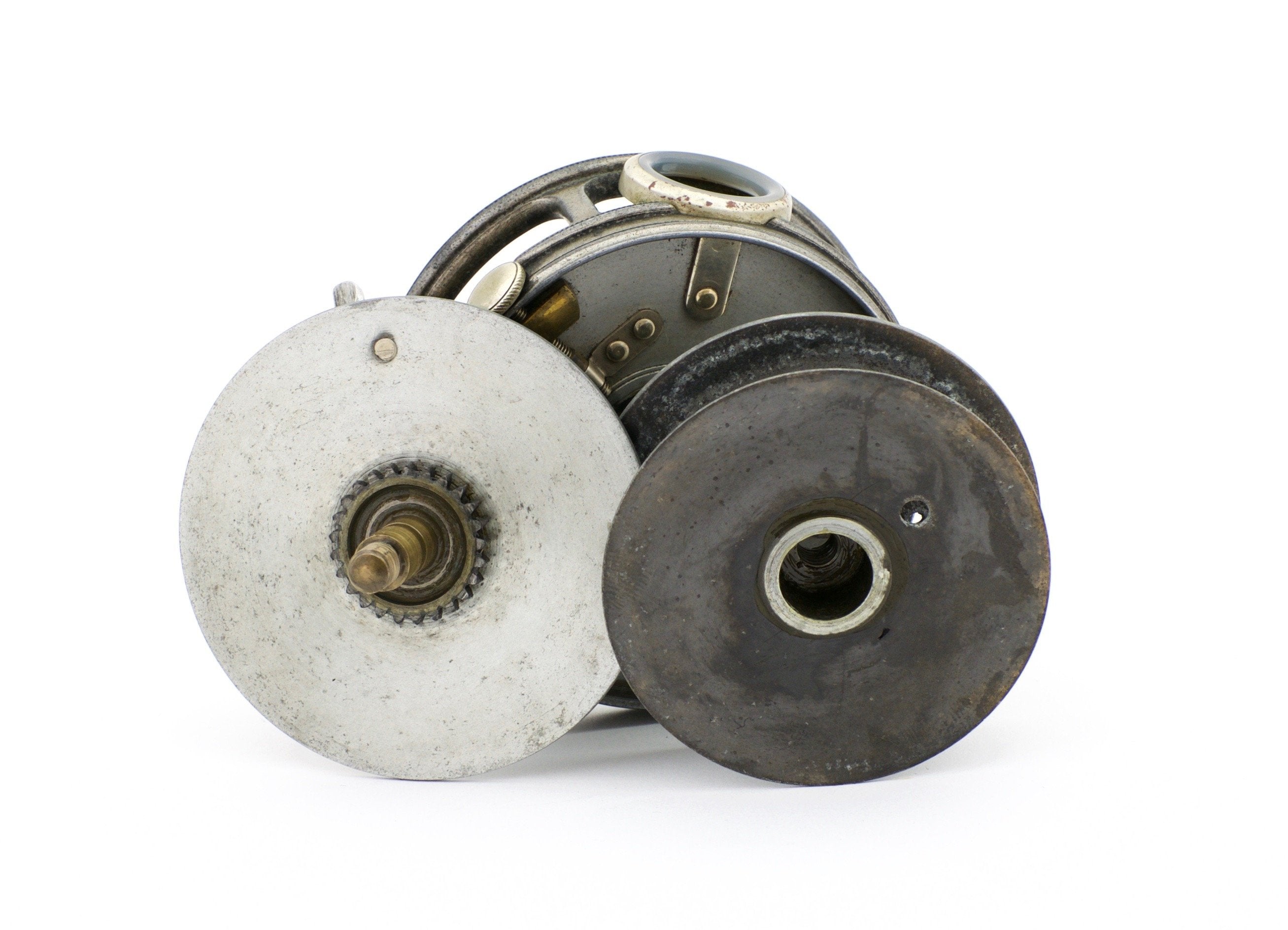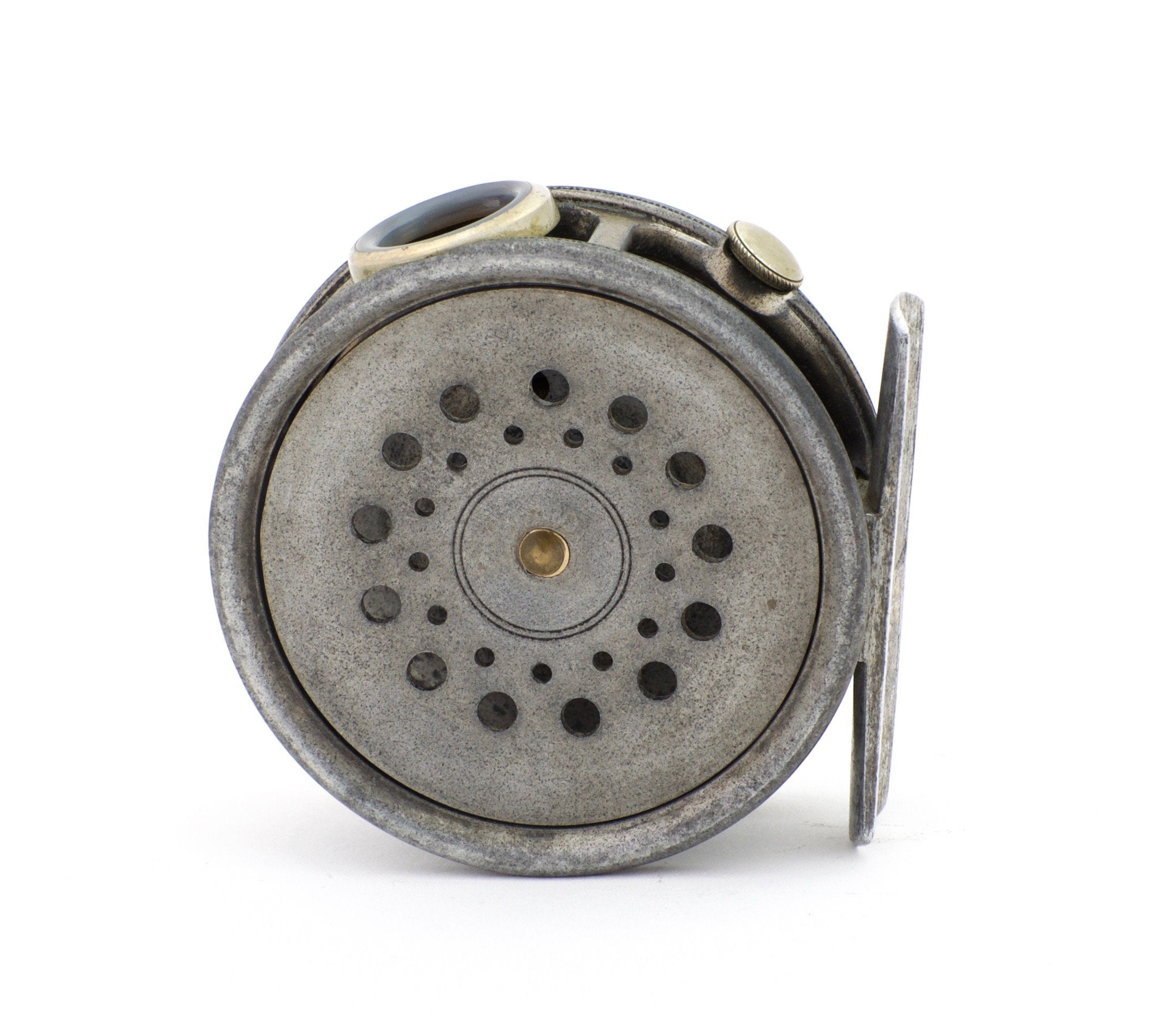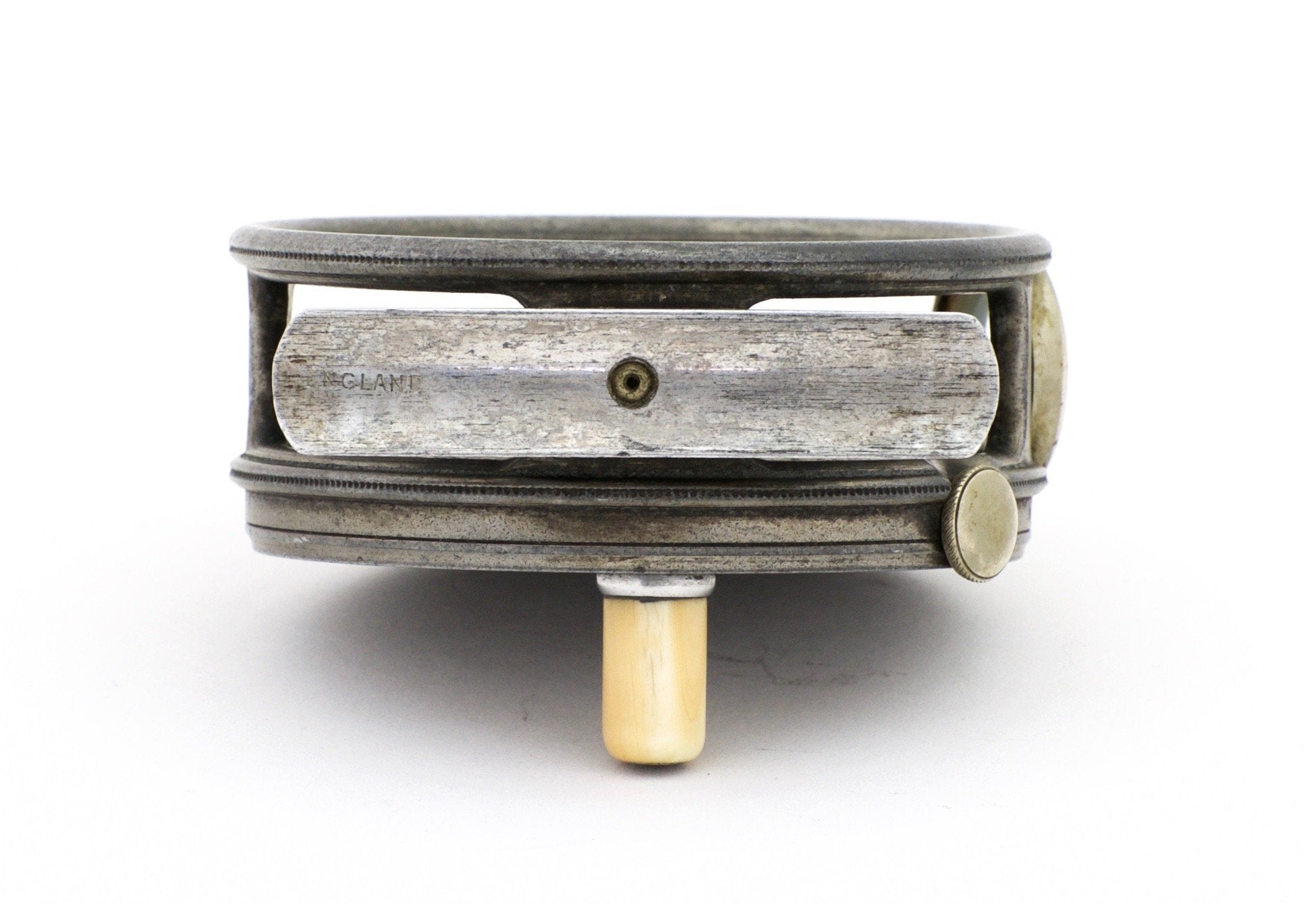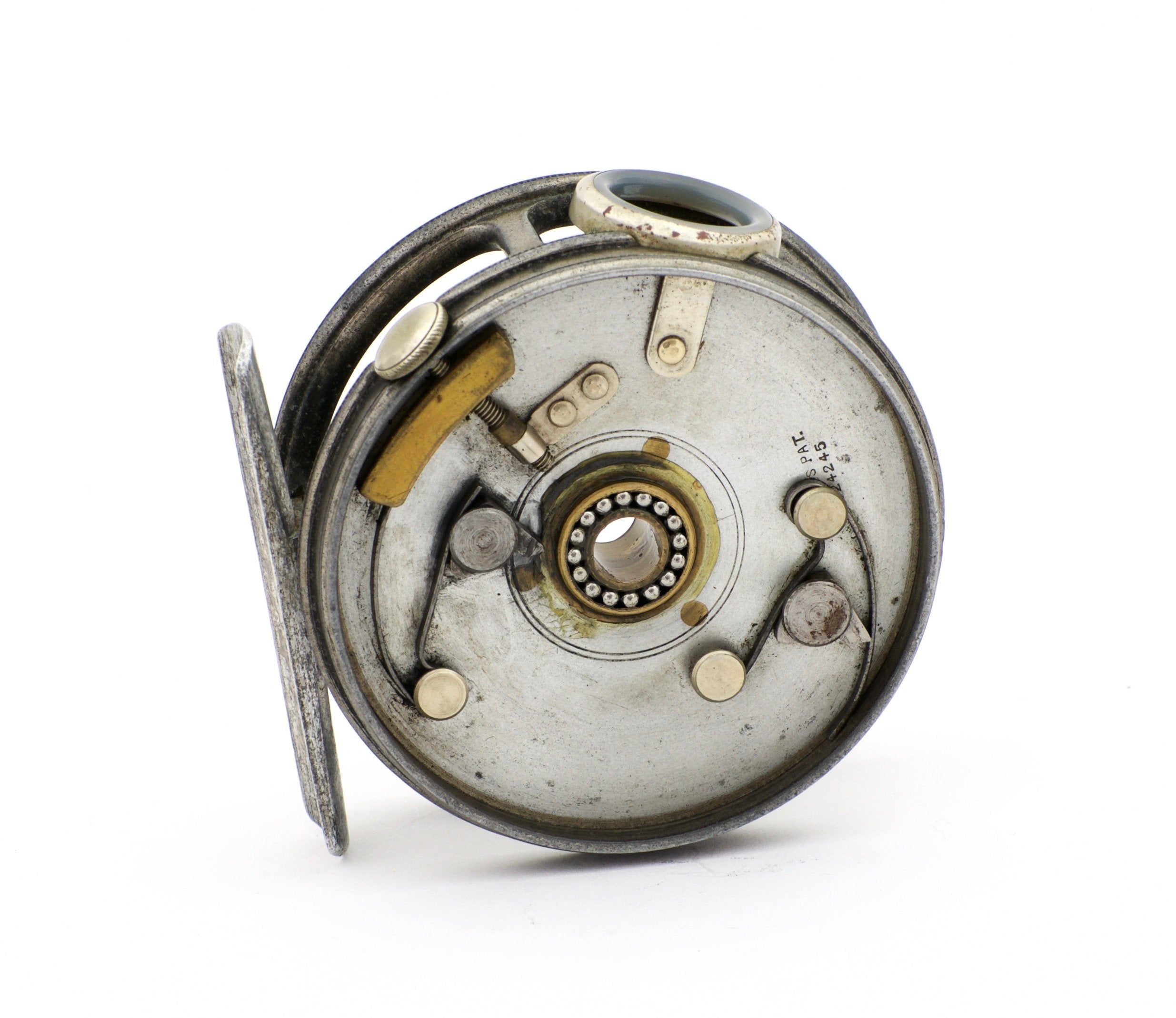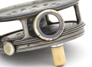 For sale here is a 2 7/8" Hardy Perfect fly reel with Hardy's Duplicated MKII check mechanism with a non-engageable spare spring and pawl. Flawless blue/grey agate line guide. Much of the original leaded finish remains. The adjustable check is nice and strong and the milled tension screw works as intended. Gear teeth remain sharp. Ivorine handle spins freely. The original alloy foot is full length. No cracks whatsoever, just minor wear.