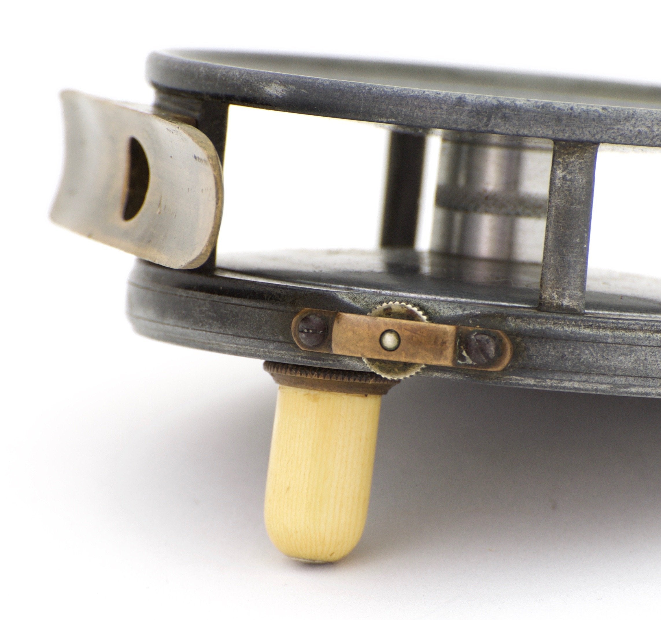 For sale here is a 3 1/8" Hardy Perfect fly reel with Hardy's 1896 check mechanism. Scarce solid spool face. Excellent remaining leaded finish. The flat caliper spring is nice and strong and the bridged tensioner works as intended. Gear teeth remain sharp. Ivory handle spins freely. The original pierced smooth brass foot is full length. No cracks whatsoever, just minor wear. No notable spool wobble or end play. Matching stamps throughout. As shown in the photos there is some amateurly-applied initials in the winding plate but they are fairly faint.