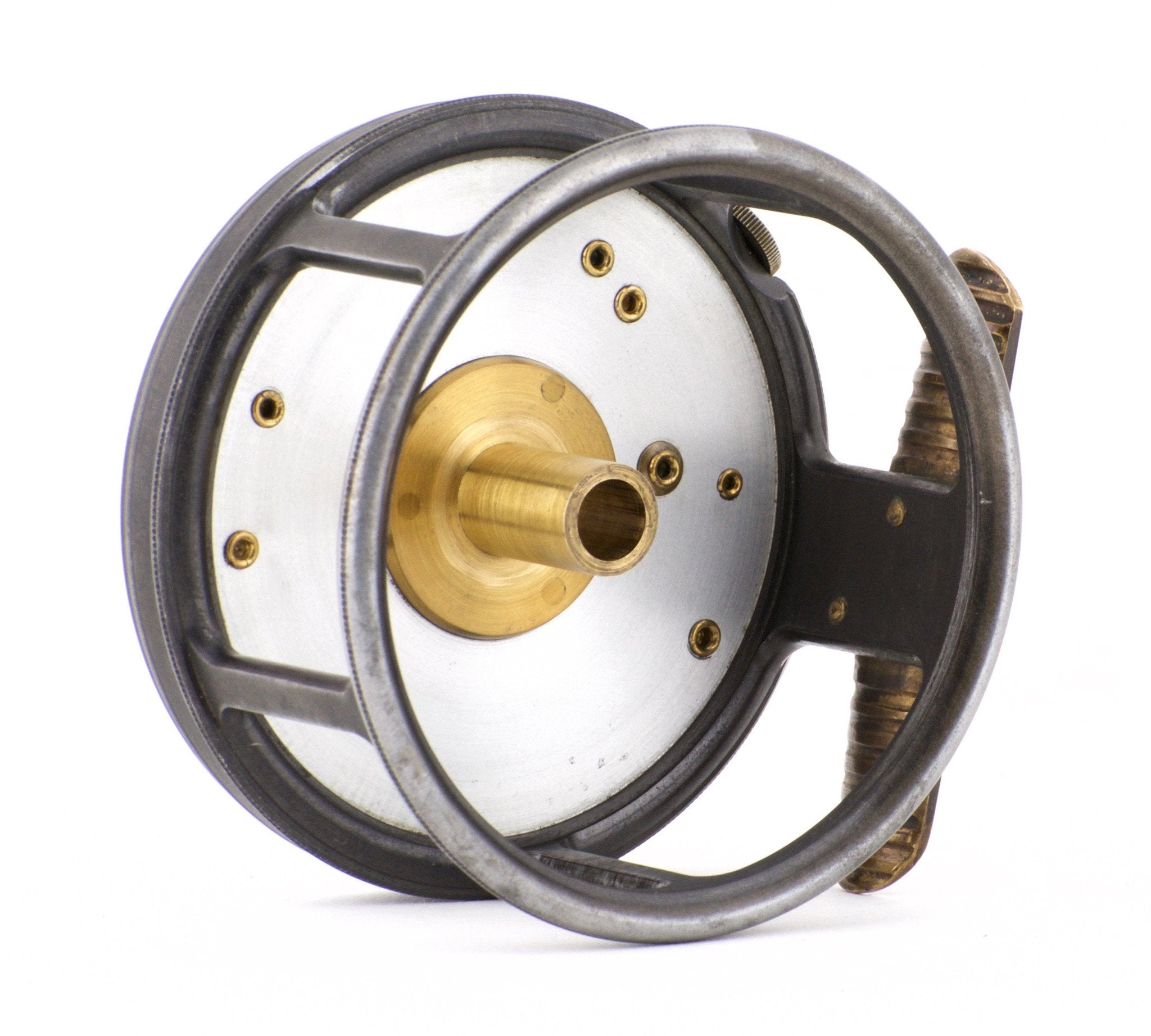 For sale here is a very nice example of a pre-war Hardy Perfect Duplicated MK II wide drum fly reel from the late 1920s. Much of the leaded surface still remains. Original, unmolested ribbed brass foot. The tensioner functions perfectly throughout its range. The spool/spindle fit is nice and tight. The ebonite handle spins freely. No cracks, chips, or dings. The initials "JS" (for Jimmy Smith) appear on the winding plate. All in all, a spectacular pre-war Hardy wide drum Perfect in a very desirable size.