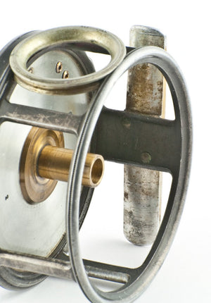 For sale here is a great example of the much sought-after Hardy Perfect with 1917 check mechanism. This is the 3 3/4" diameter wide drum model. There have been no repairs or everything about the reel appears to be original. Full length unmolested smooth alloy foot that measures 3 1/2" in length. No chips, cracks or dings. No line grooves to the pillars or the rotating nickel silver line guard. The tensioner works perfectly throughout its range. Very strong check. Ivory handle is perfect. All parts of the reel are stamped with a "3". The reel retains much of its original finish and mechanically it's a 9 out of 10. The reel weighs 13.1 oz. The inner flanges of the spool show some finish wear due to an old silk line being stored on the reel for a very long time. There is no corrosion to be worried about, simply a loss of finish which you won't even see with new line and backing on the reel.
