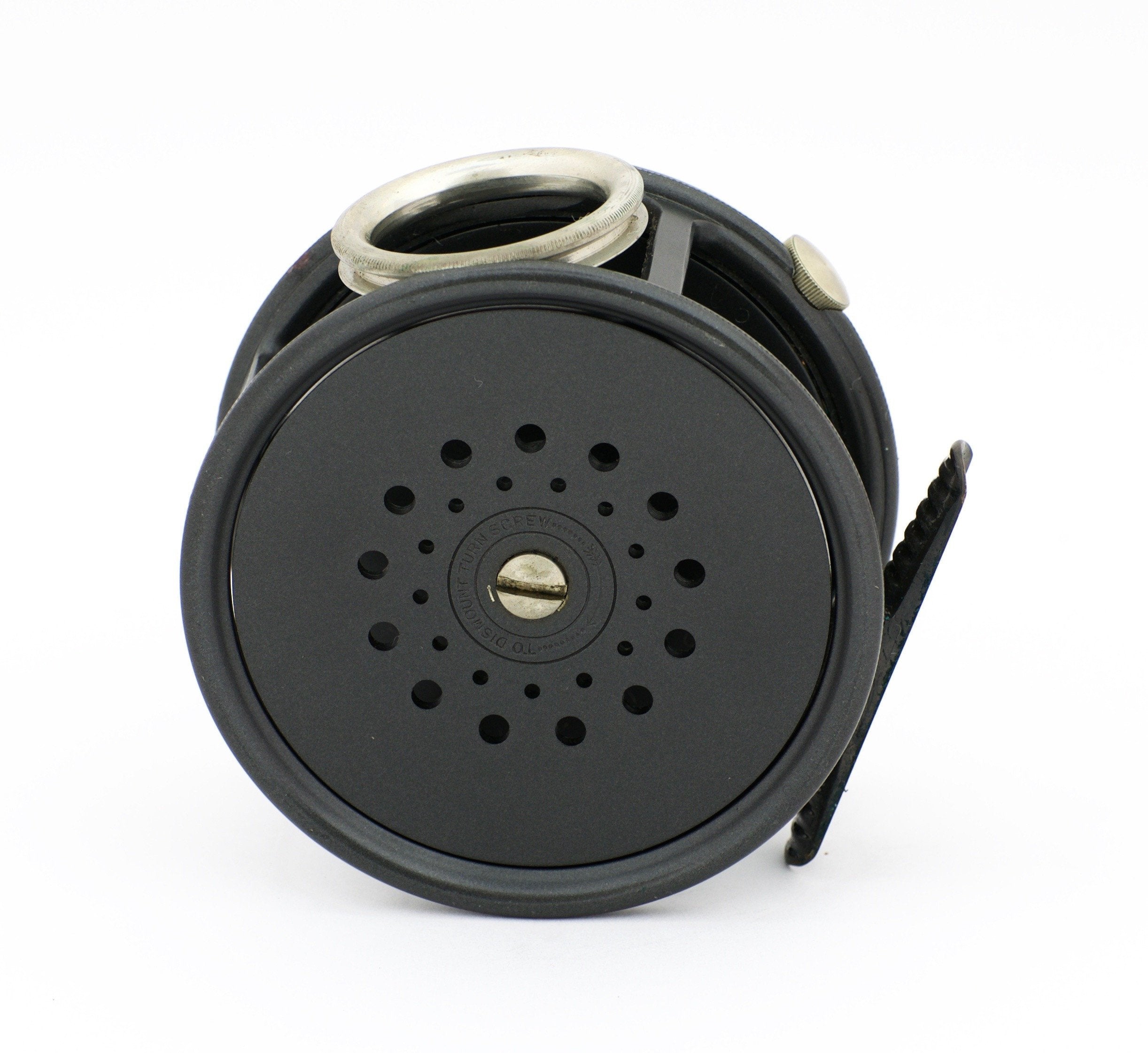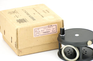 For sale here is an extremely high-quality example of a post-WWII Hardy Perfect wide drum fly reel. 3 3/4" diameter. Weight is 12.80 oz. Near mint condition. The reel features a german silver rotating line guide. Duplicated MKII check. The original ribbed brass foot is unaltered and is 2.6" in length. The tensioner functions perfectly throughout its range. The spool/spindle fit is perfectly tight. The ebonite handle spins freely as it should. It also comes with its original card box with label fully intact. All in all, a spectacular Hardy wide drum reel in a difficult to find size!