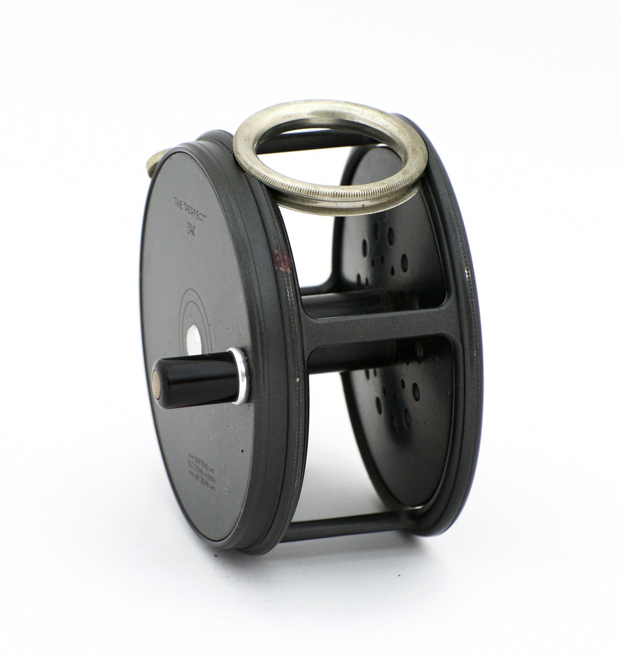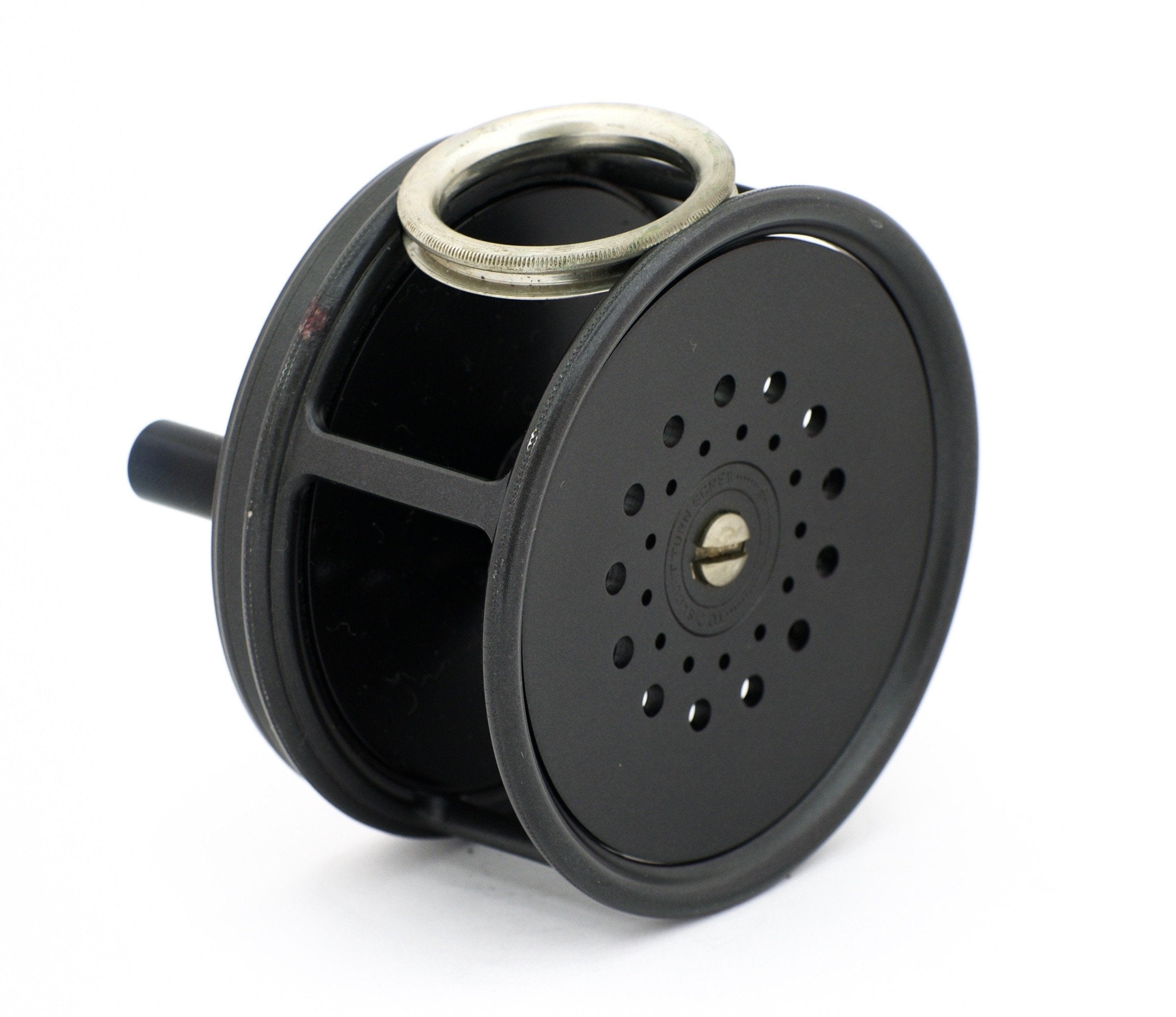 For sale here is an extremely high-quality example of a post-WWII Hardy Perfect wide drum fly reel. 3 3/4" diameter. Weight is 12.80 oz. Near mint condition. The reel features a german silver rotating line guide. Duplicated MKII check. The original ribbed brass foot is unaltered and is 2.6" in length. The tensioner functions perfectly throughout its range. The spool/spindle fit is perfectly tight. The ebonite handle spins freely as it should. It also comes with its original card box with label fully intact. All in all, a spectacular Hardy wide drum reel in a difficult to find size!