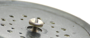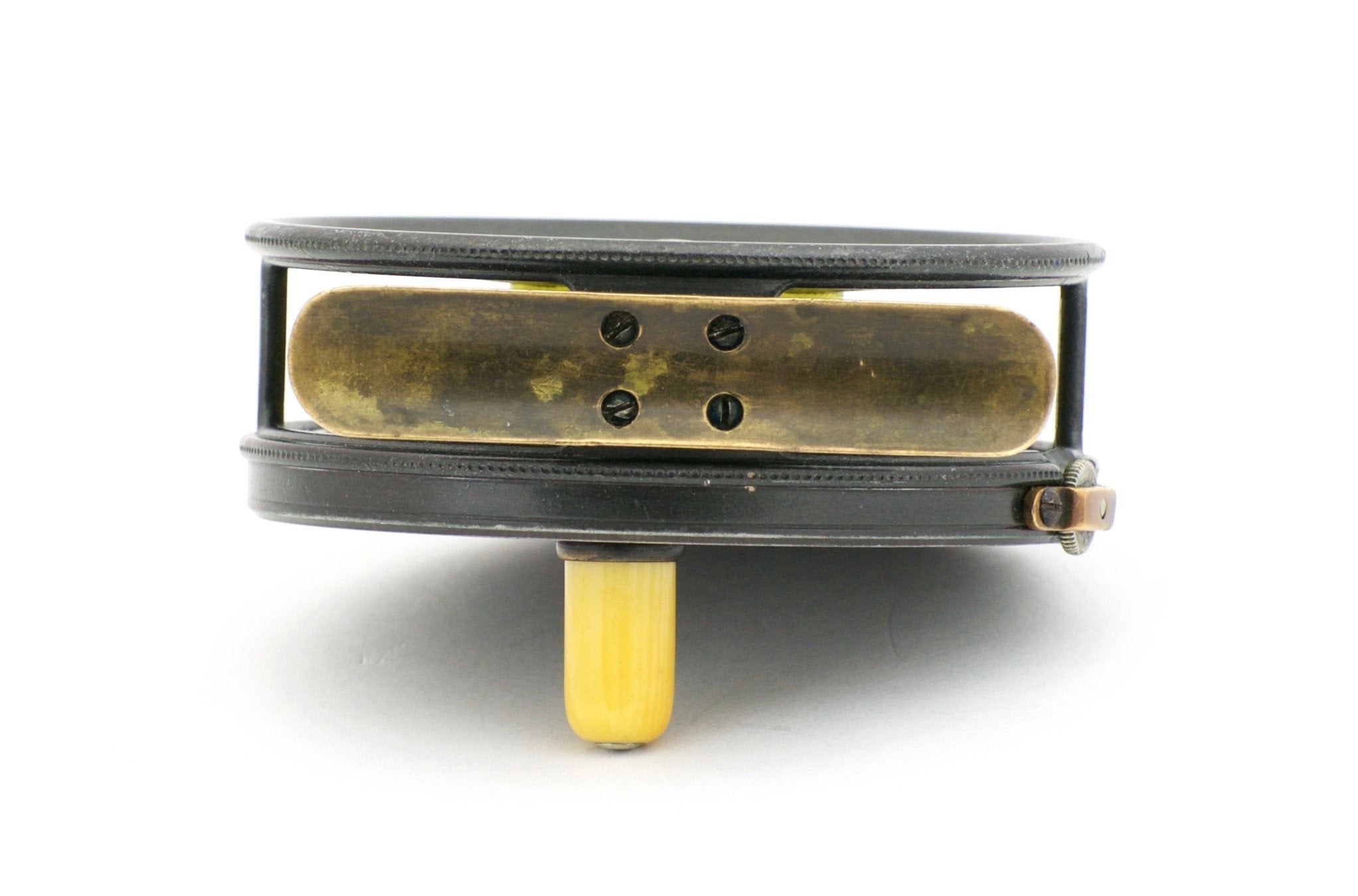 For sale here is a Hardy Perfect with the highly coveted 1912 check mechanism. 3 3/8" diameter. Full length and unaltered smooth brass foot. The fine ivory handle spins freely. Strap over tensioner works perfectly. Stamped "13" throughout. There are no cracks and no line grooves, just a bit of surface wear to the leaded surface where line stripping occurred and an overcoat of some sort of protectant or paint on the leaded surface. There are a few very small dings to the frame and some very slight imperfections to the outer spool surface as well. Additionally, one of the parts inside has been replaced but it was expertly carried out as the operation of the reel is top-notch and the fit is nice and tight. You can see the bright brass component with the two replaced screws in the attached photos. The reel weighs 6 7/8 oz. (with the backing) and the reel foot length is 2 7/8".