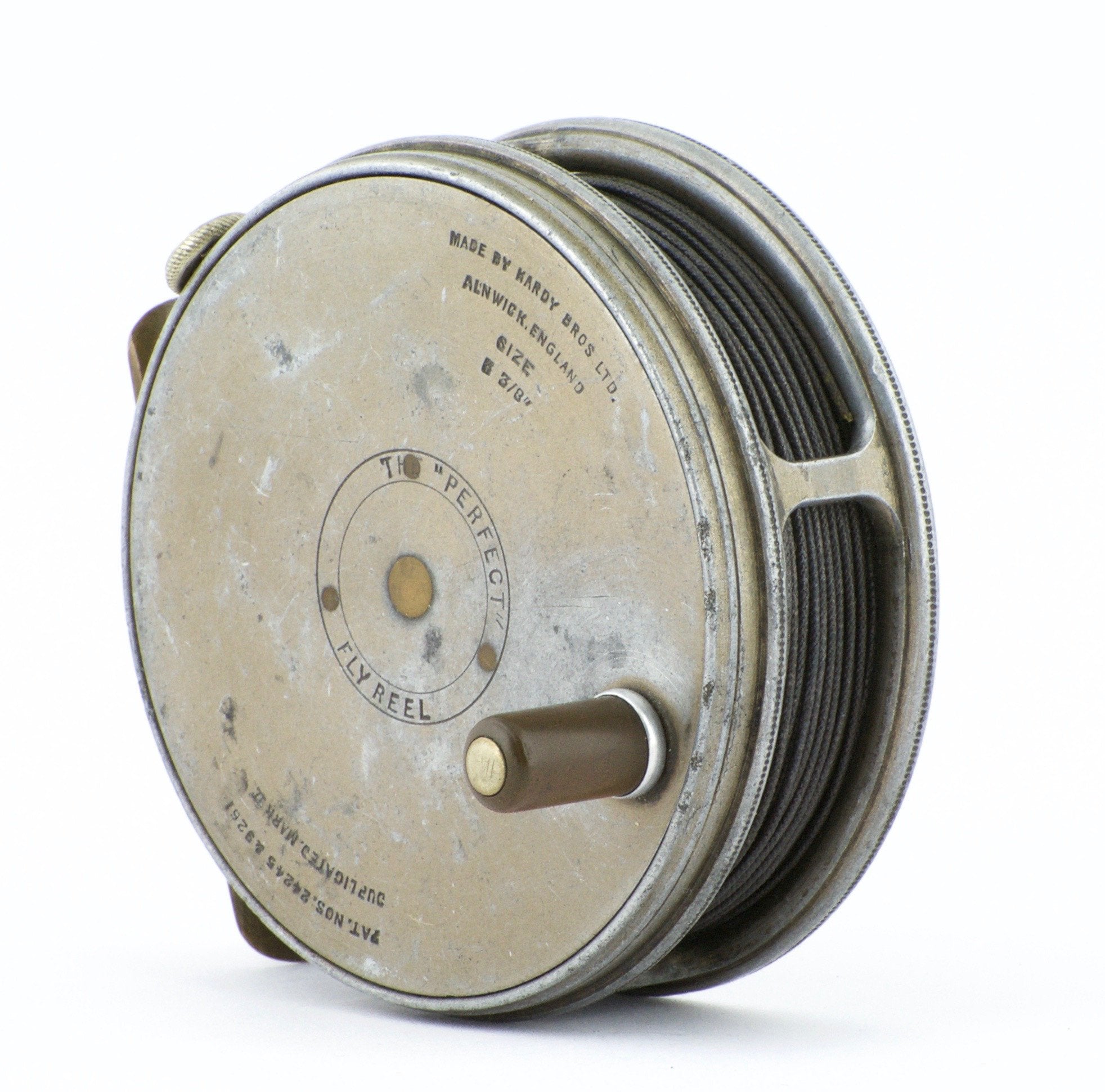 For sale here is a 3 3/8" Hardy Perfect with Dup. MKII check. Made in the mid 1920s. The full length ribbed brass foot is unaltered. The ebonite handle spins freely. No cracks or line burns.