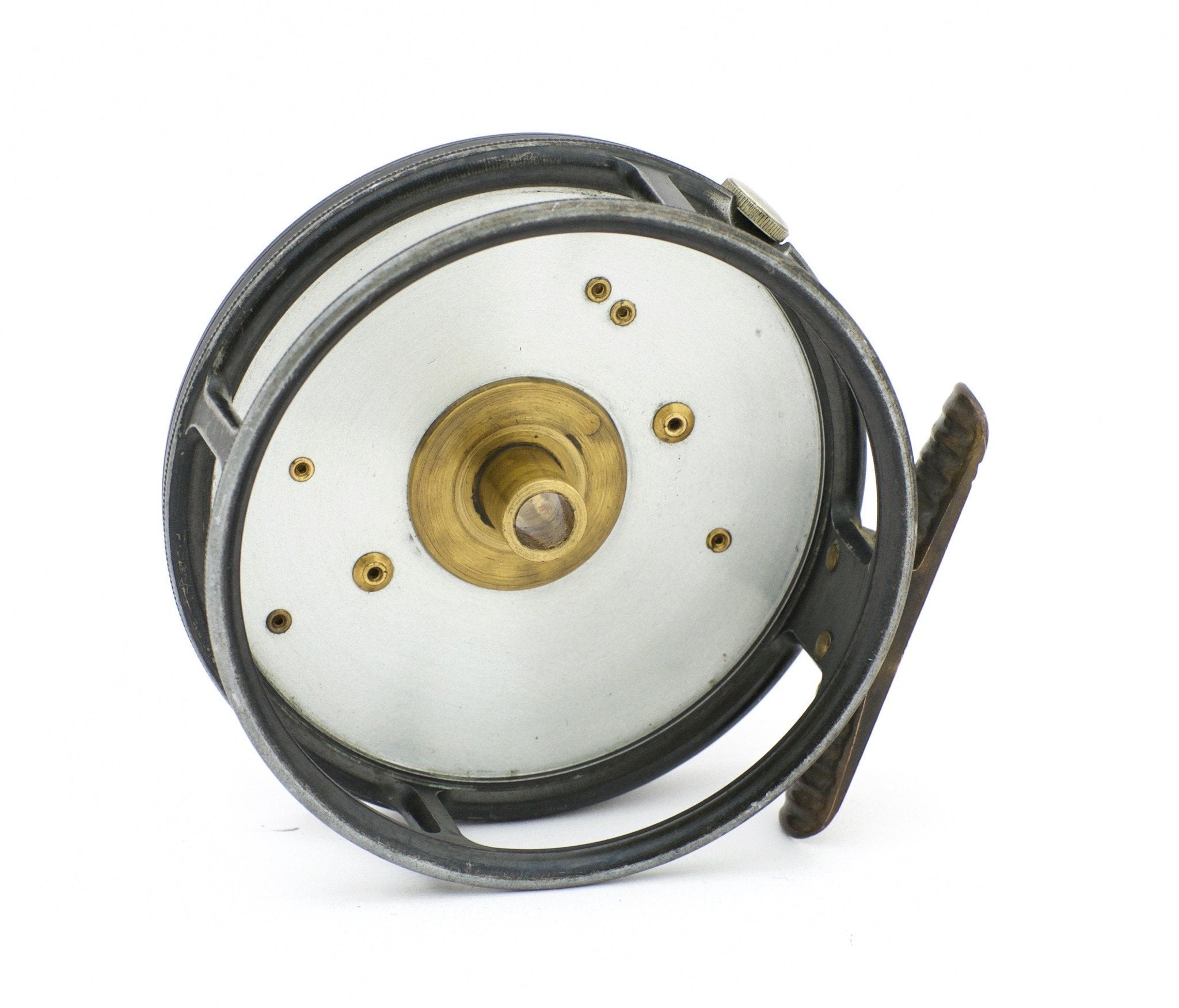 For sale here is a pre-WWII Hardy Perfect. 3 7/8" diameter. Right hand retrieve. The capacity is approximately WF8 plus 100 yards of 20# backing. The ebonite handle spins freely. The tension regulator works as intended. Nice leaded finish. Ribbed brass foot is unmodified. Nice example!