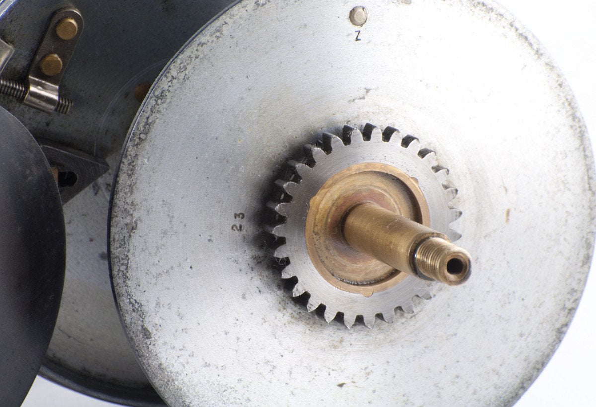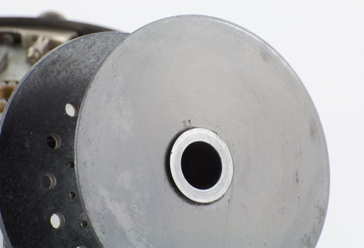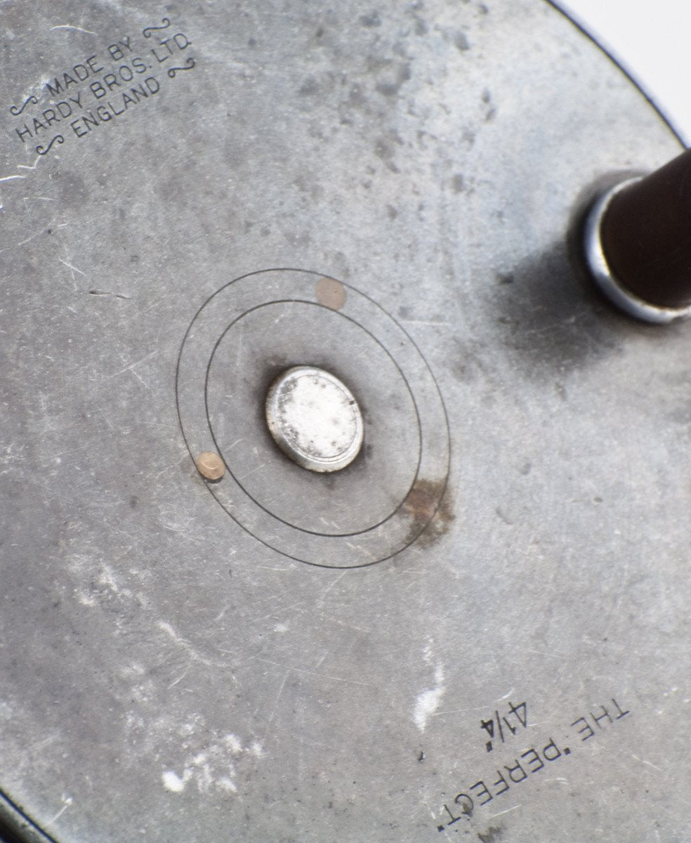 For sale here is a 4 1/4" Hardy Perfect wide drum fly reel with MKII check and revolving line guard. Straight-line lettering on the winding plate. A nice example of one of the last of the leaded Hardy reels. The reel is in excellent condition mechanically, tight and without issue. No cracks. Tensioner works as intended and has a wide functional range. Full length ribbed brass foot is original and hasn't been messed with. Nice ebonite handle spins freely and isn't one of the stubby handles that some dislike. Great spool/spindle fit.