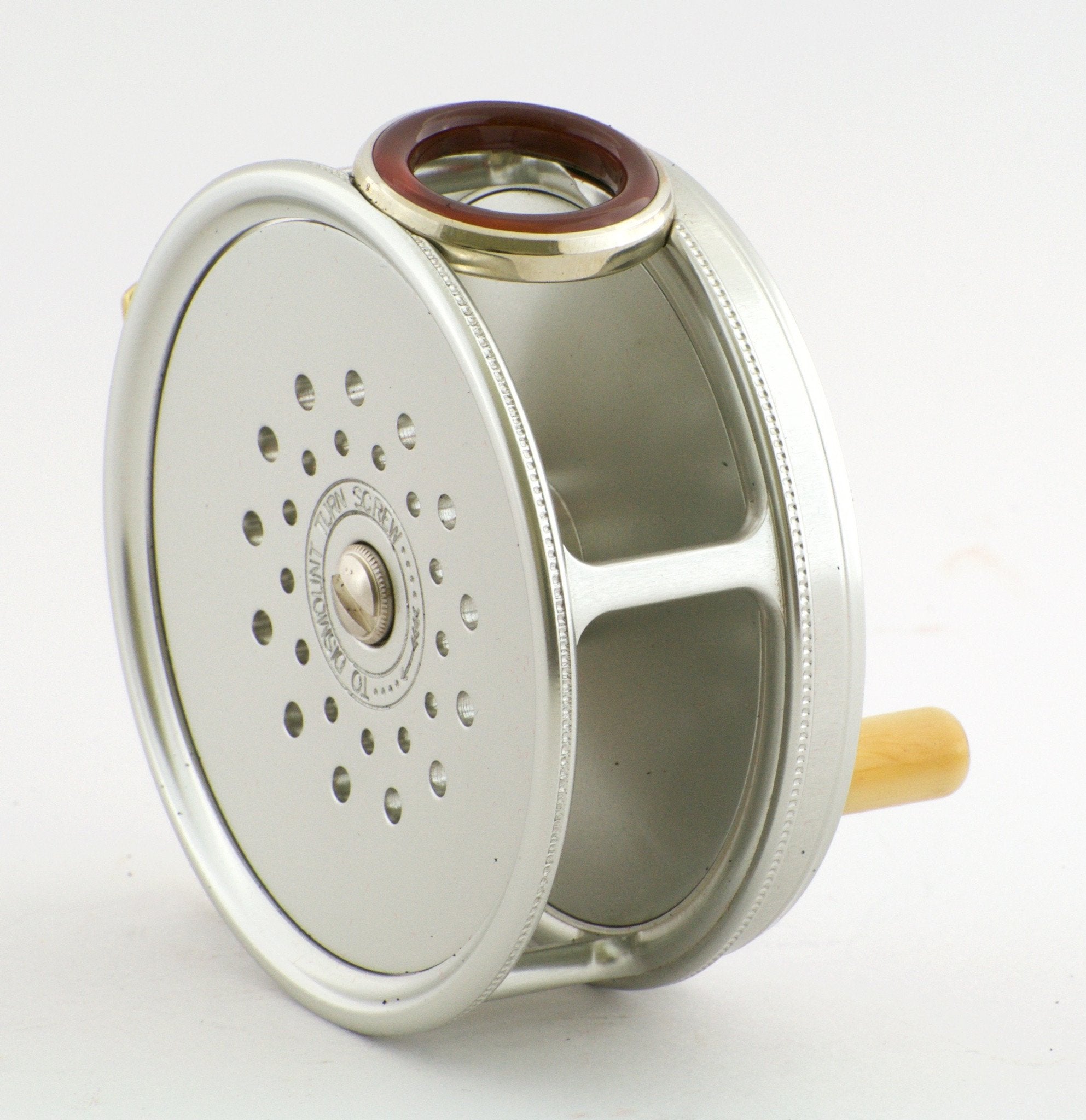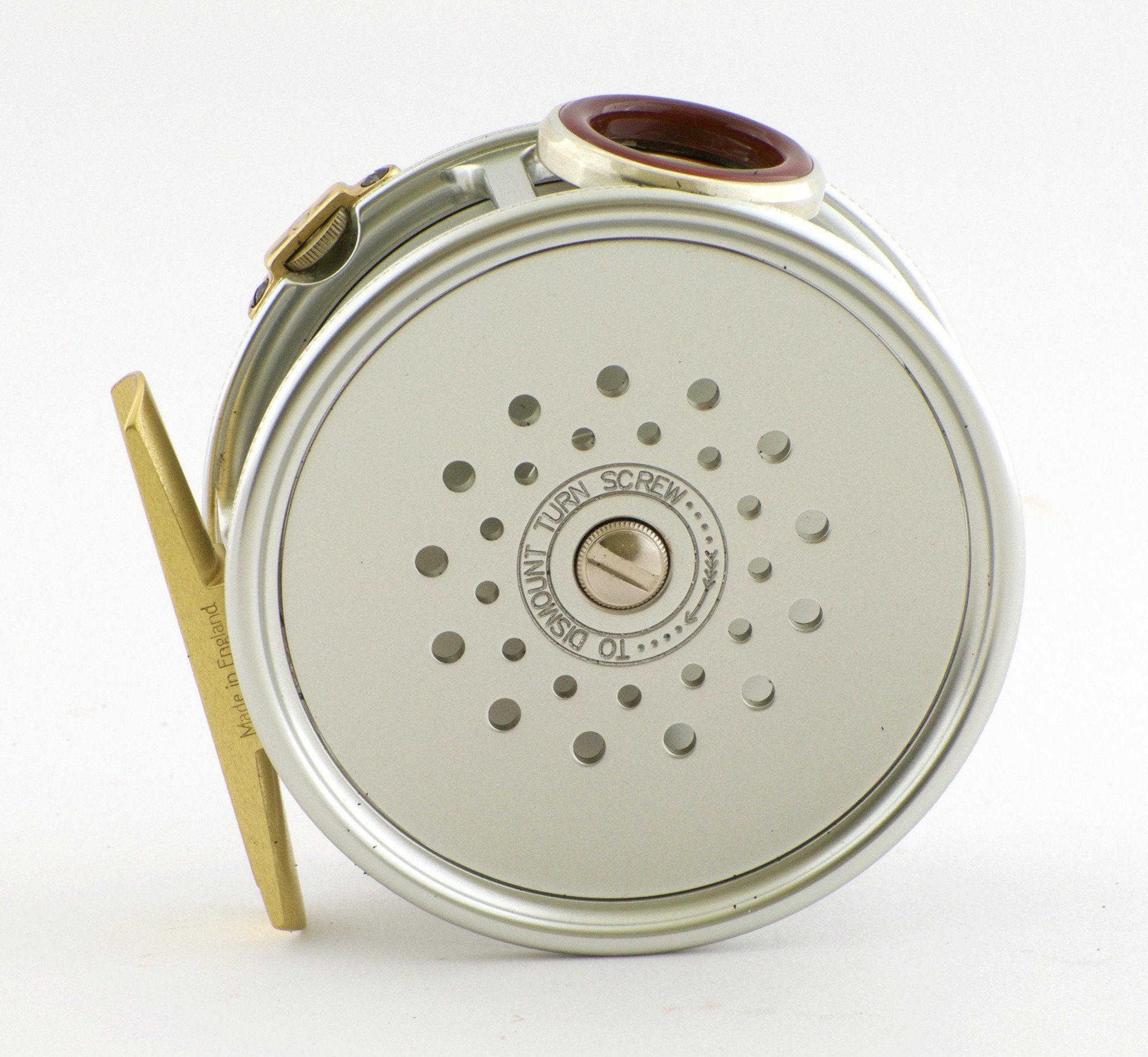 For sale here is a Hardy Perfect Diamond Jubilee Limited Edition Fly Reel. New condition. Left hand retrieve. One of a limited edition of just 250 to commemorate the Queen's Diamond Jubilee and 140 years of Hardy Bros. Equipped with red agate line-guard set in a handmade nickel silver bezel. 1912 adjustable check system with ivorine handle. Supplied with its original marked presentation box as well as a commemorative limited edition collectors Hardy Bros Medallion. Also included is a handmade black leather reel case. 3 1/4" diameter.5.9 oz. Capacity DT6+35m or WF7+60m.