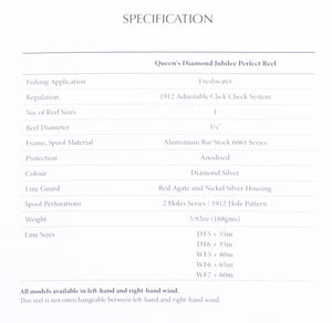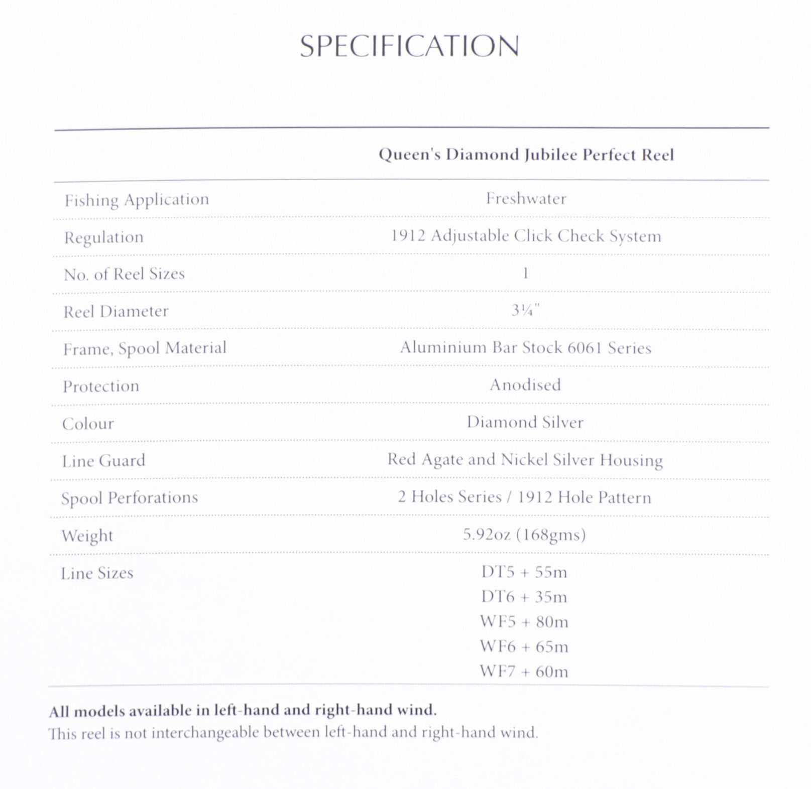 For sale here is a Hardy Perfect Diamond Jubilee Limited Edition Fly Reel. Near mint++ condition. Left hand retrieve. One of a limited edition of just 250 to commemorate the Queen's Diamond Jubilee and 140 years of Hardy Bros. Equipped with red agate line-guard set in a handmade nickel silver bezel. 1912 adjustable check system with ivorine handle. Supplied with its original marked presentation box as well as a commemorative limited edition Hardy Bros Medallion. Also included is a handmade black leather reel case and paperwork. 3 1/4" diameter.5.9 oz. Capacity DT6+35m or WF7+60m.