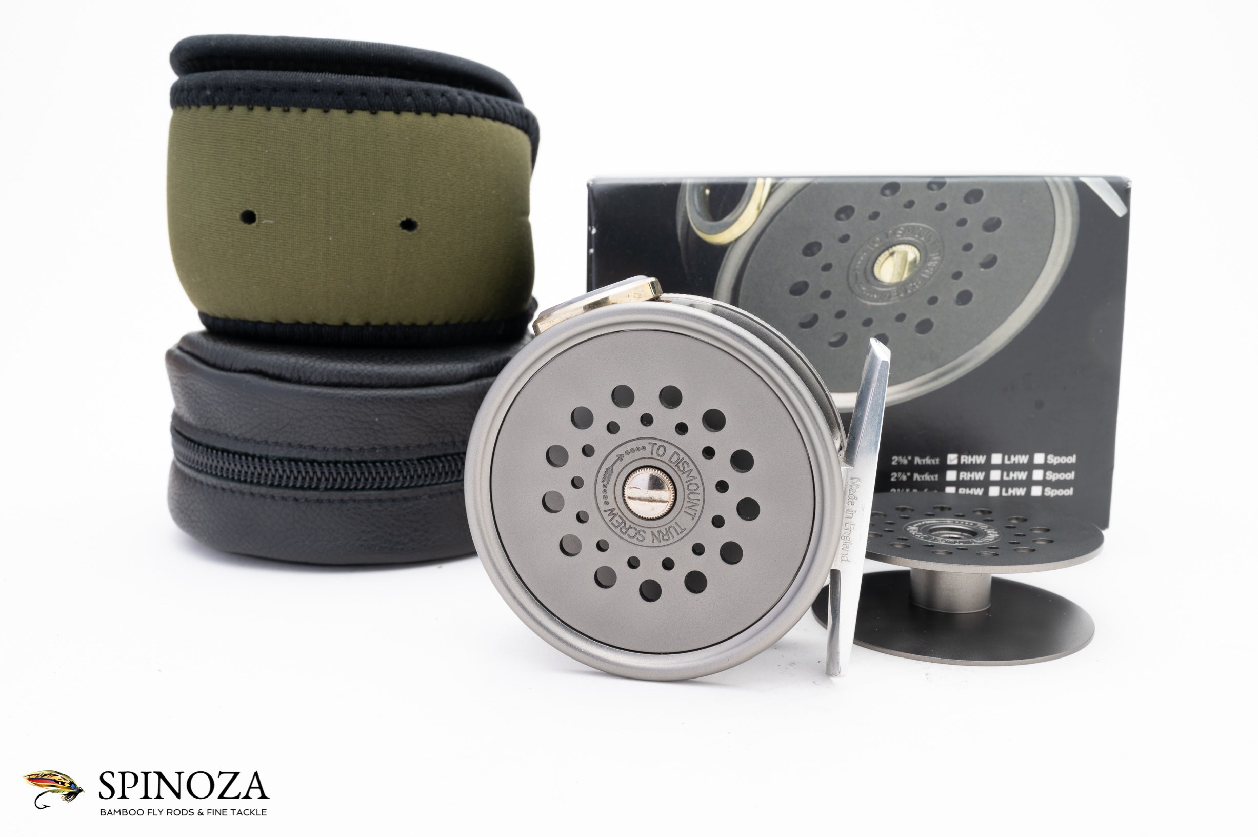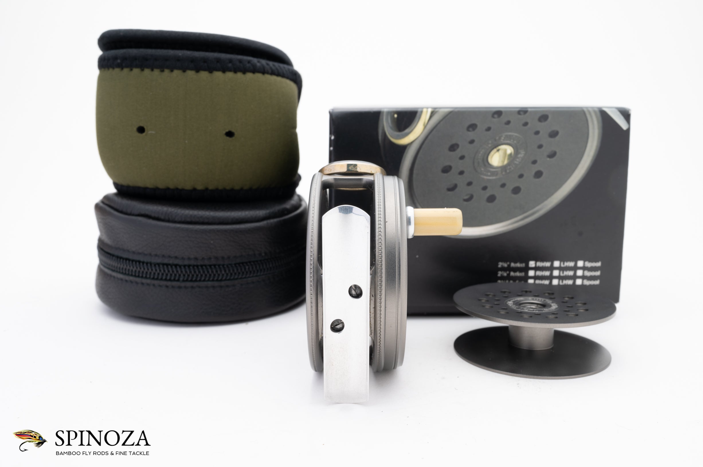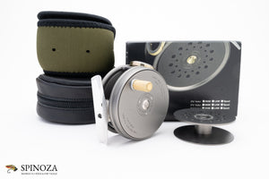 A nice Hardy Perfect fly reel, 2 5/8" diameter, set up for RHW. There are some faint mounting marks on the foot but the reel appears mint and unfished otherwise. Flawless agate. Spare spool has a line sticker on the inside but appears unused and comes in an olive neoprene pouch. The reel comes with box, zippered leather reel case, and paperwork.