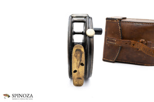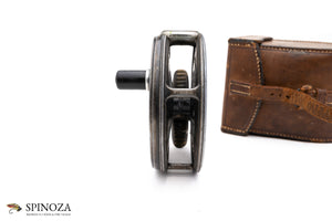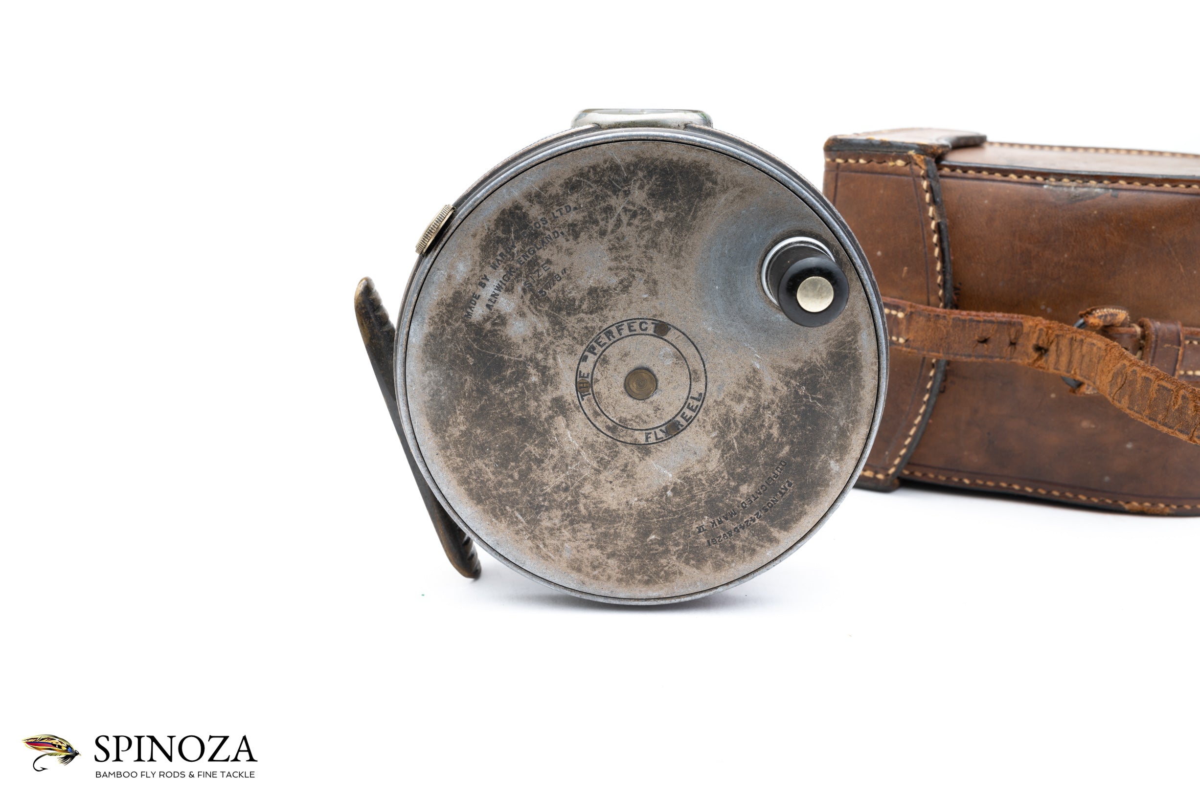 A nice Hardy perfect fly reel, 3 7/8" diameter and set up for RHW. An earlier leaded model. Duplicated Mark II check. Good used condition with some fading to the leaded patina throughout, and there is a crack in the agate lineguard, but the reel is mechanically sound and nice and tight. There is some fly line residue to the spool that should be removable with a good clean. Ribbed brass foot. The drag tension adjuster works as it should. The ebonite handle spins freely. The reel packs into a handsome Hardy block leather case that is in good condition.