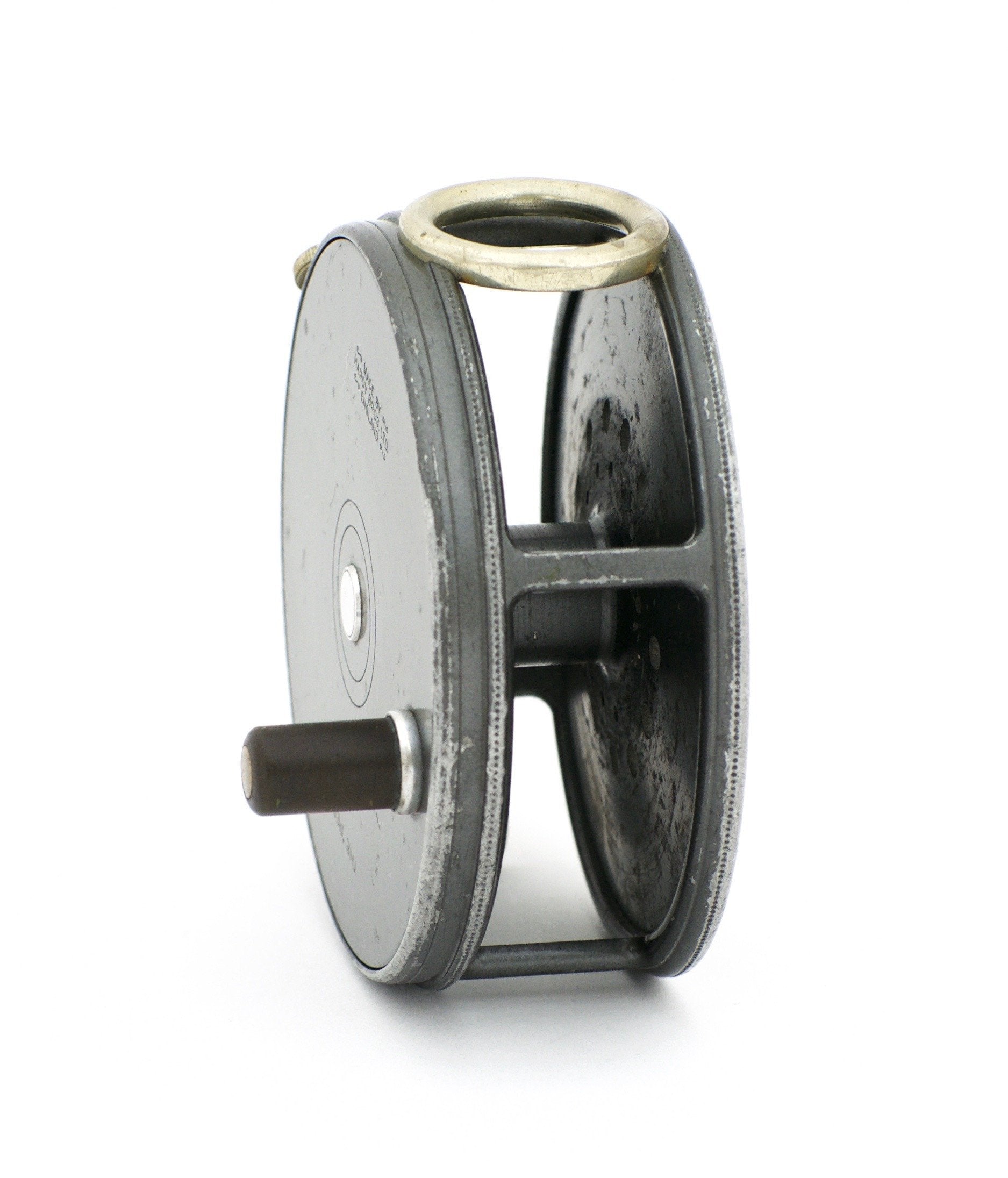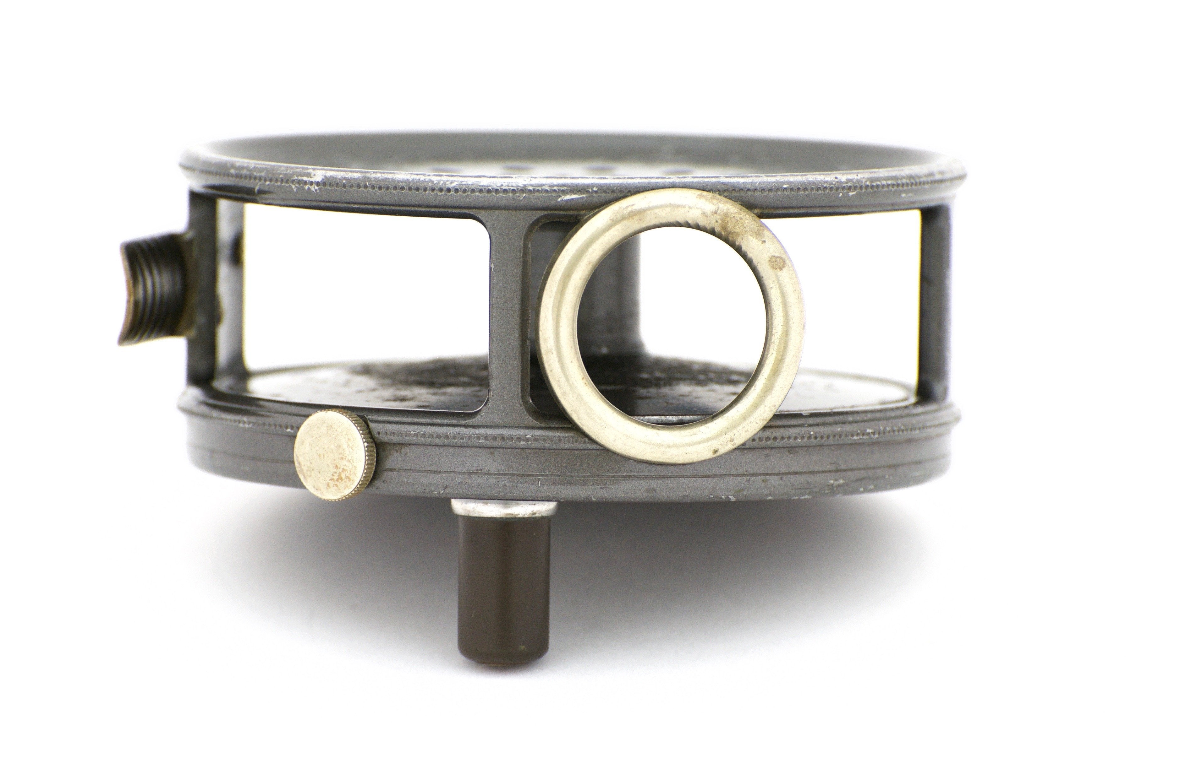 For sale here is an original 1958-1962 Hardy Perfect Taupo fly reel. 3 7/8" diameter. 1" spool width at its widest point. Weight is 9 1/2 oz. Excellent used condition with cosmetic marks. Right hand retrieve. Nickel silver line guide, which was optional on the Taupo version. Original and unaltered ribbed brass foot measuring 2 1/2" in length. These reels will hold 120 yards of 30lb dacron and a mid belly line or 150 yds of 30lb plus 125 ft of mono shooting line and the skagit or scandi line of your choice.