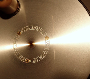 The reel is in unused condition but has some type of straight-line mark on the faceplate as shown in the last photo (perhaps from being compressed against the spare reel foot while housed in its original presentation leather case). The photo makes it seem worse due to holding it toward a bright light source when snapping the photo.
