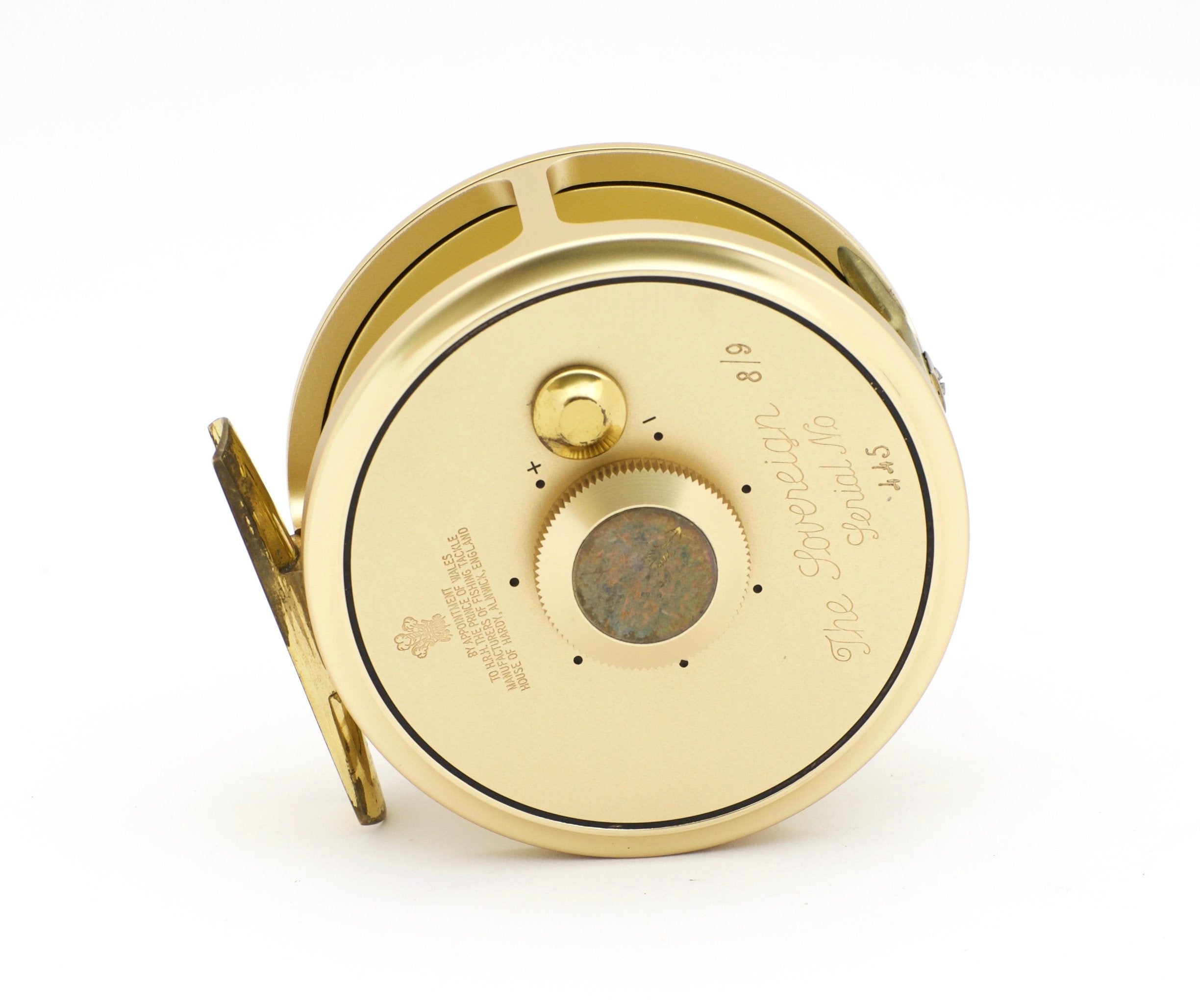 For sale here is a Hardy Sovereign 8/9 fly reel. 3 1/2" diameter. 1" wide spool. Unused condition. Slight tarnish on the brass reel foot, but not from fishing. Right or left hand retrieve, currently set up for left. The handle on this reel (like the Abel walnut handles) is an upgrade from the typical handles and was made by Bill Archuleta. Comes with Hardy case and instruction sheet.