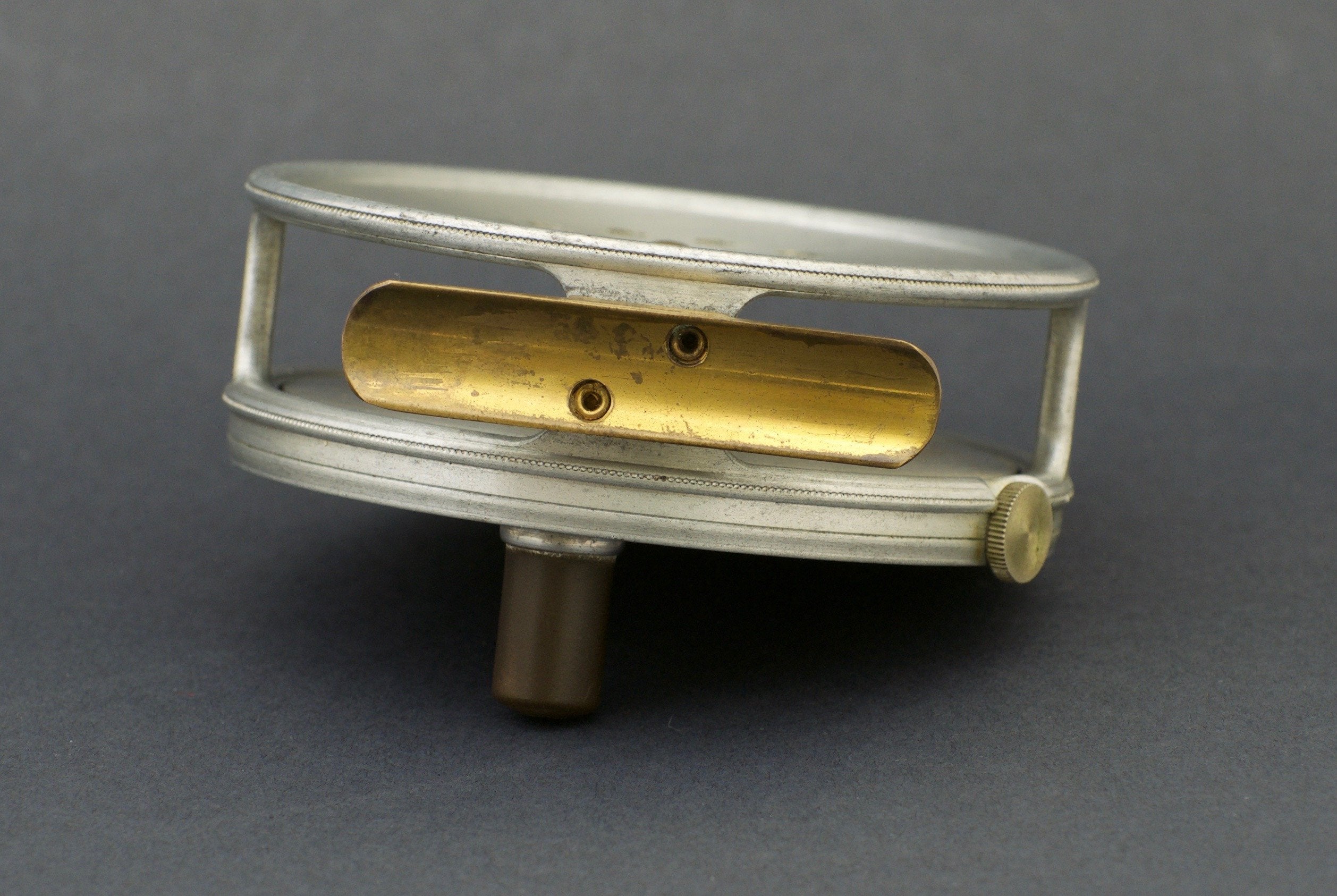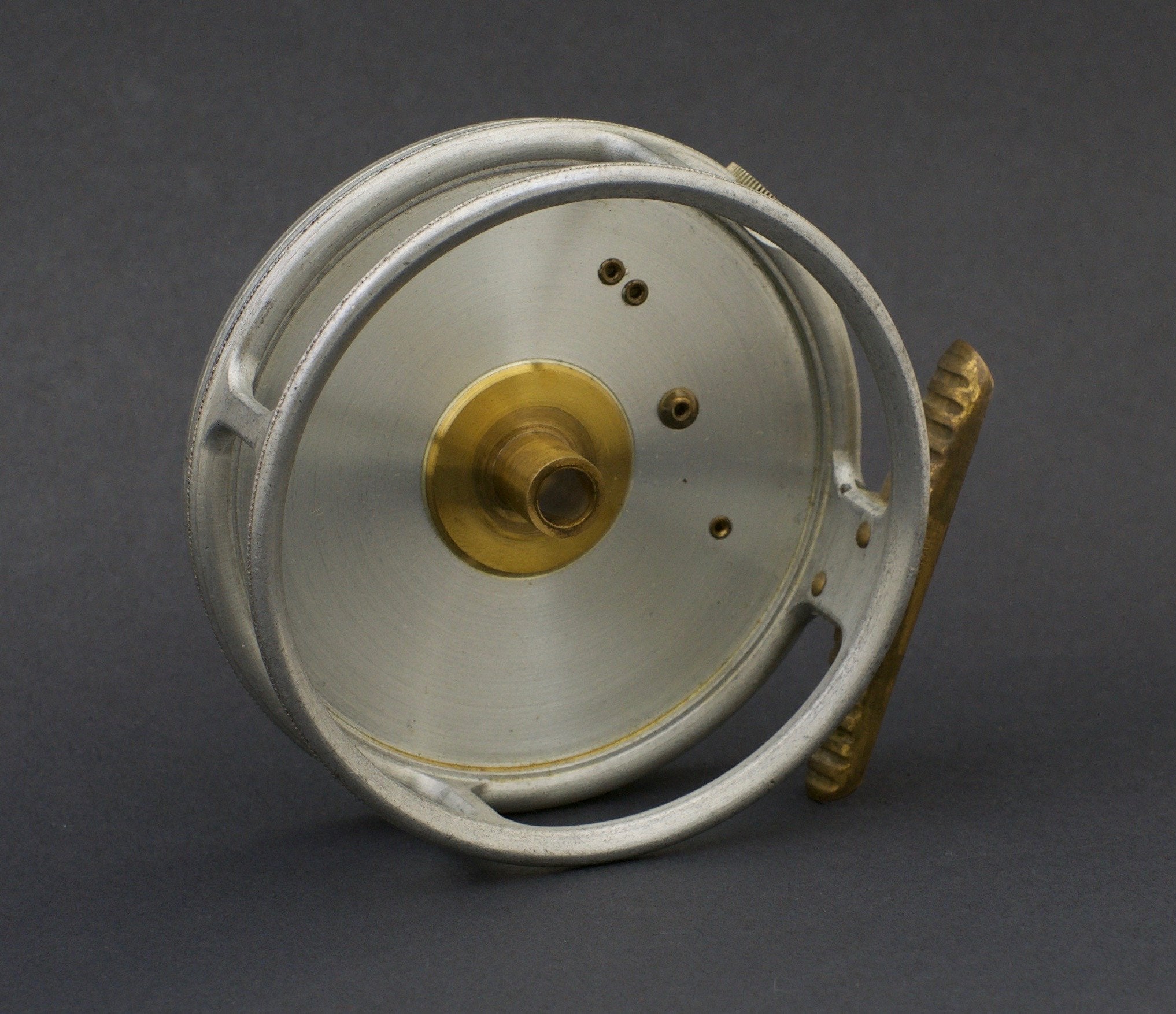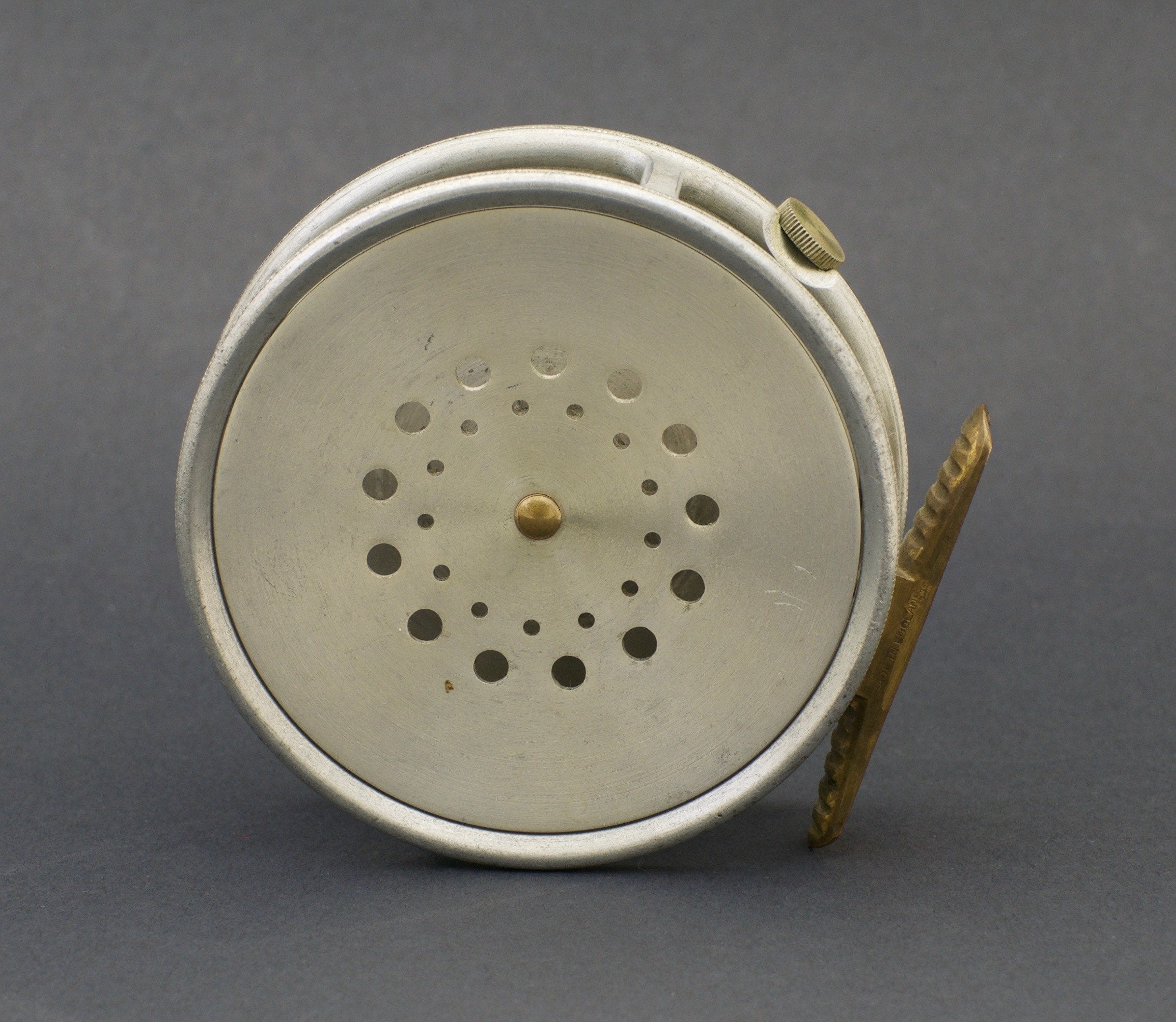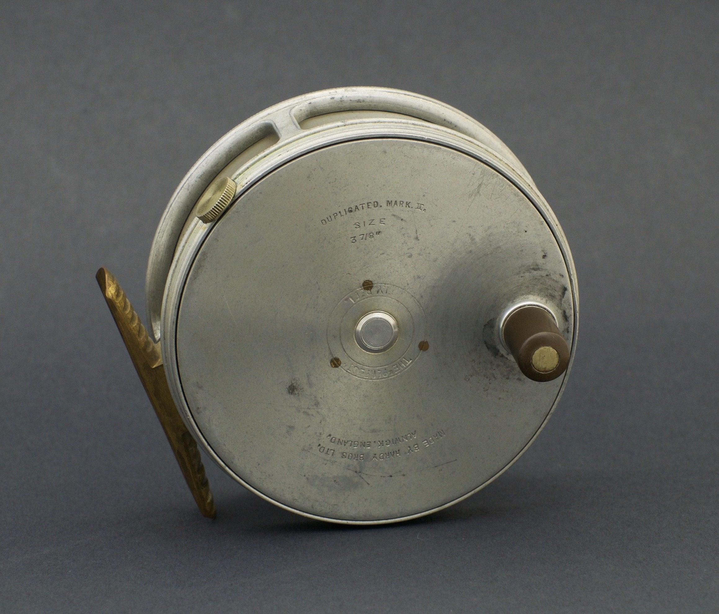 For sale here is a Hardy Perfect fly reel - 3 7/8" diameter. MKI check - Jimmy Smith wartime era. Original spitfire finish. Three-screw latch. Excellent overall condition. Right hand retrieve. Full length ribbed brass foot. Tensioner works perfectly.