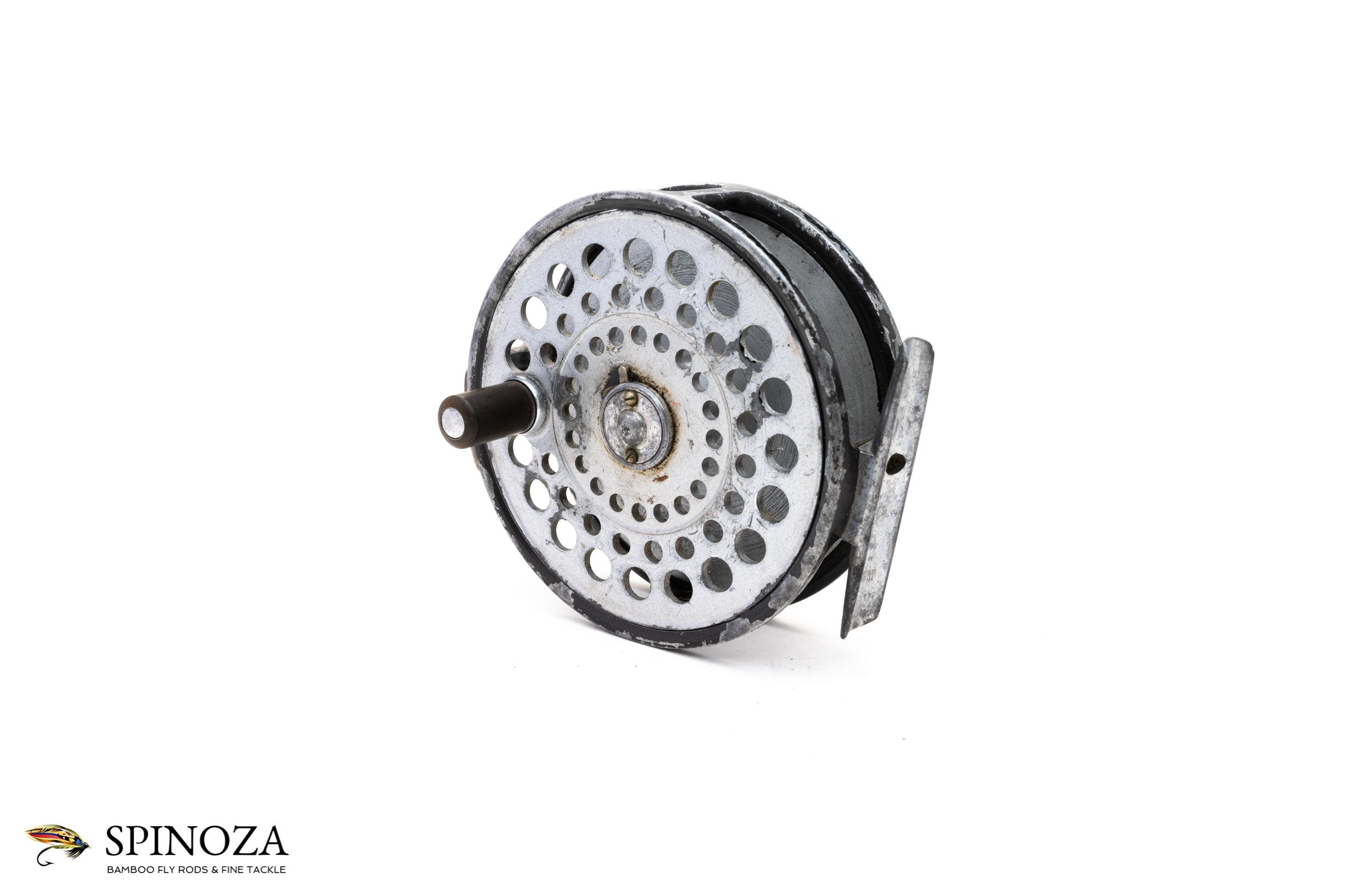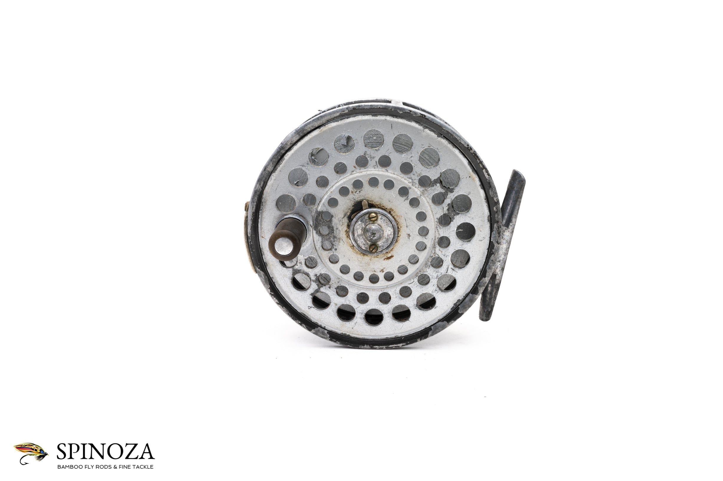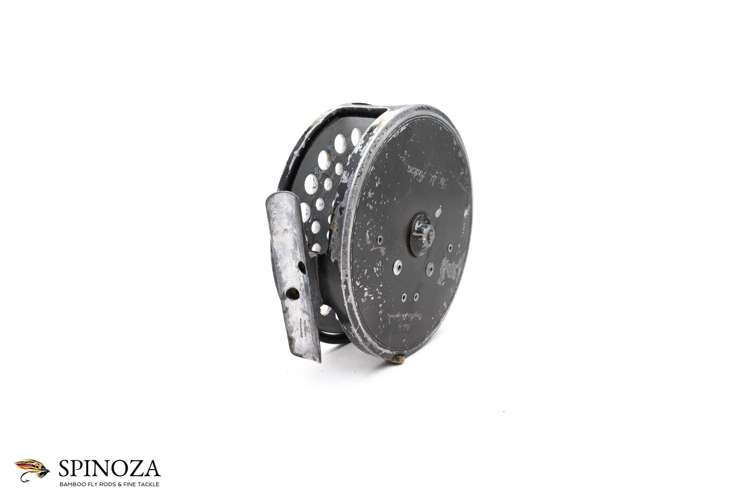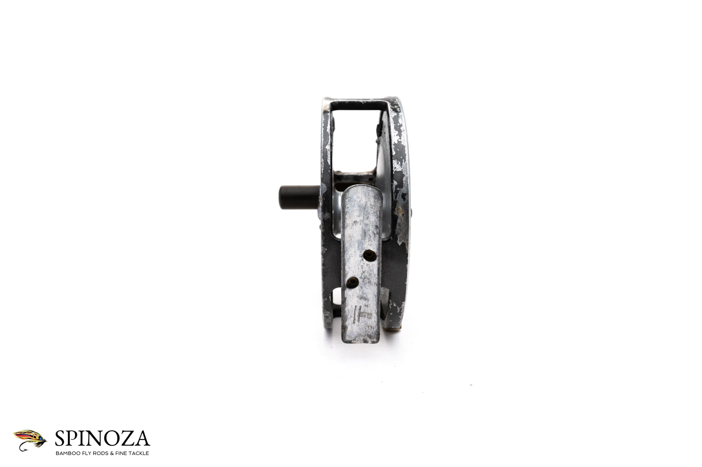 A Hardy St. Aidan fly reel, set up for RHW but easily convertible. 3 3/4" diameter, 7/8" spool width, for #7-9 lines and backing. Fair used condition with a good amount of surface wear on the frame and spool, as well as what appears to be a repaired crack in the frame edge on the spool side. Mechanically sound, with a fine click drag. Two screw latch. Reversible two-screw nickel silver line guard. Smooth alloy foot. No bag.