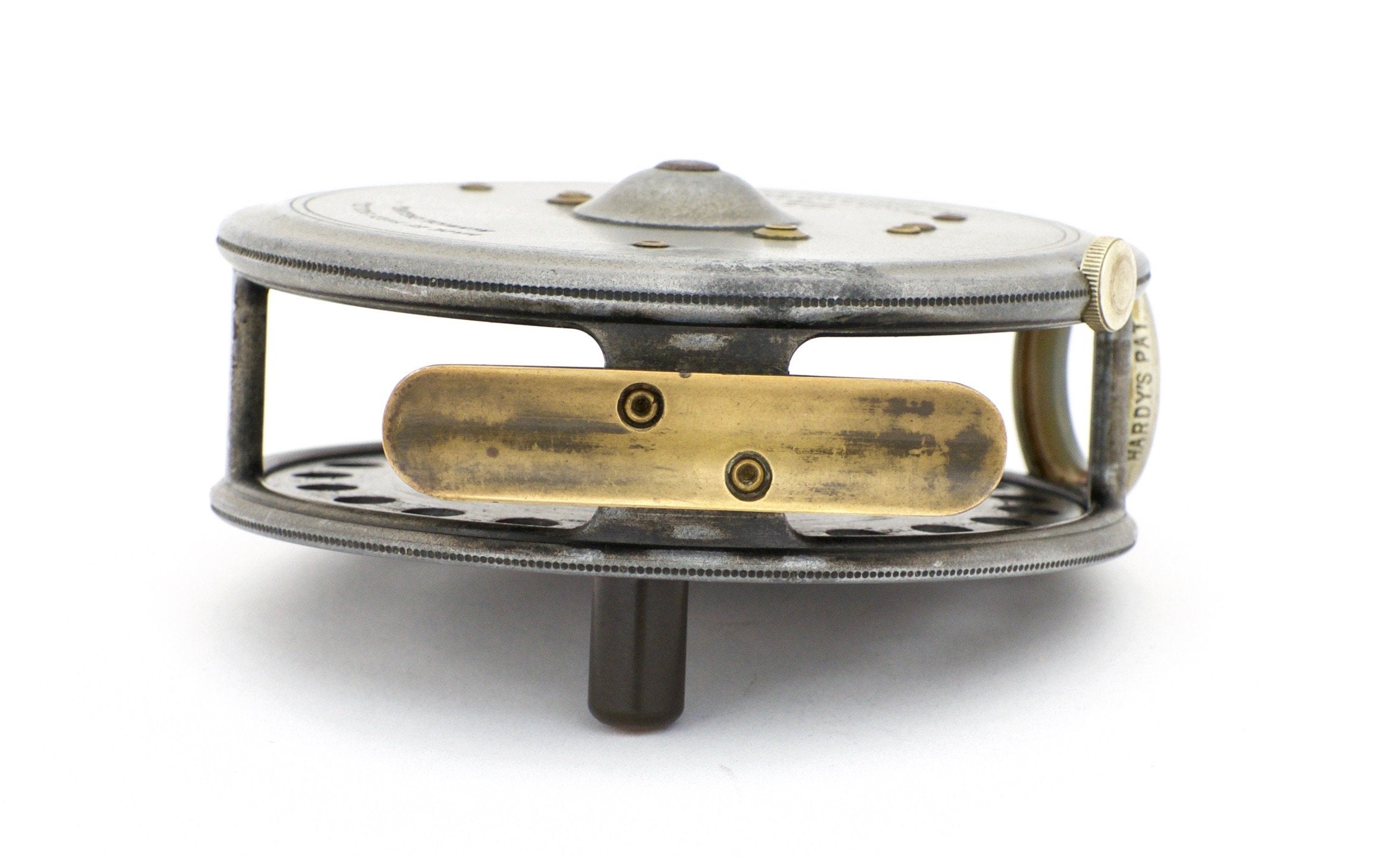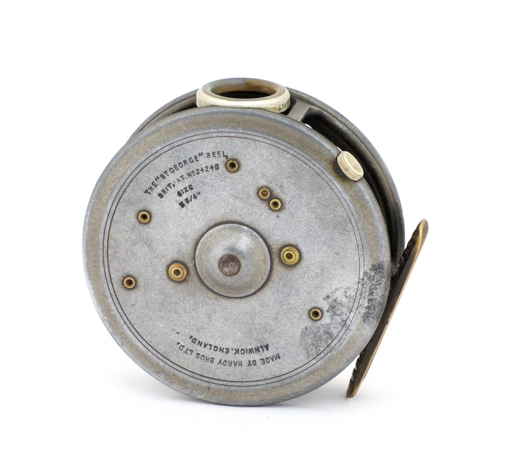 For sale here is a pre-WWII Hardy St. George 3 3/4" fly reel. Right hand retrieve. Three-screw latch. Agate line guide - unblemished, dark, and beautiful. Full length and unaltered ribbed brass foot. Ebonite handle spins freely. Tensioner works perfectly. No cracks/chips/dings. No problematic wobble or end play. Comes with contemporary Hardy reel case.