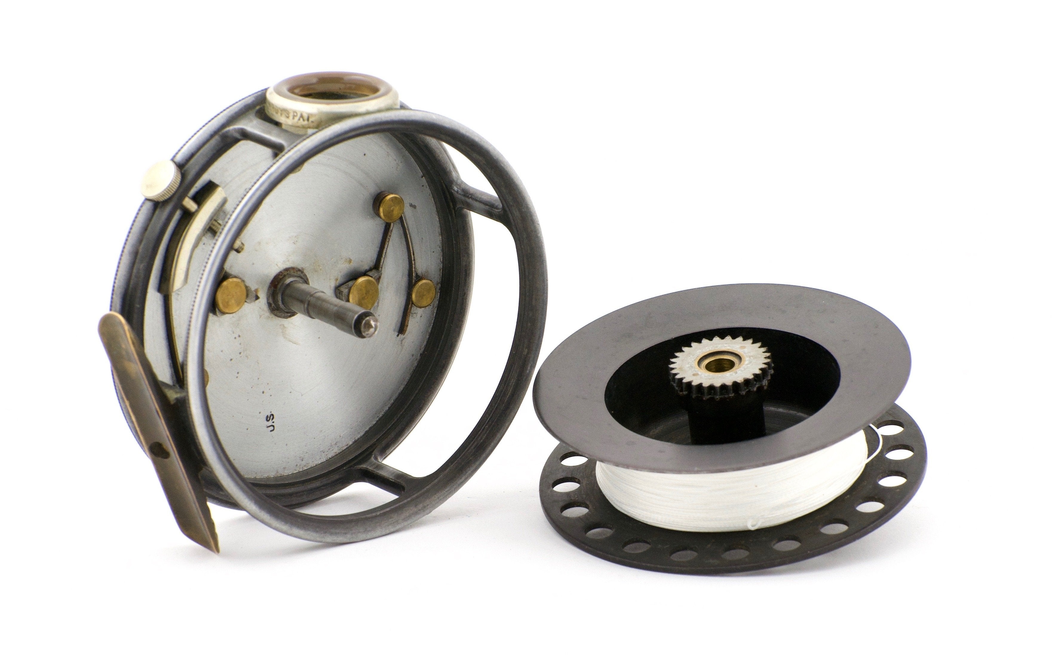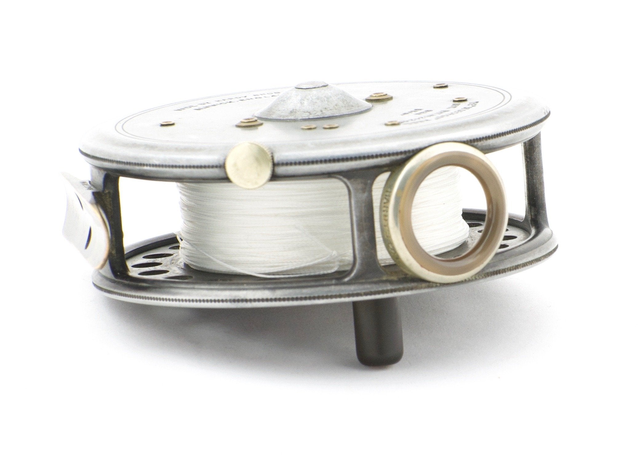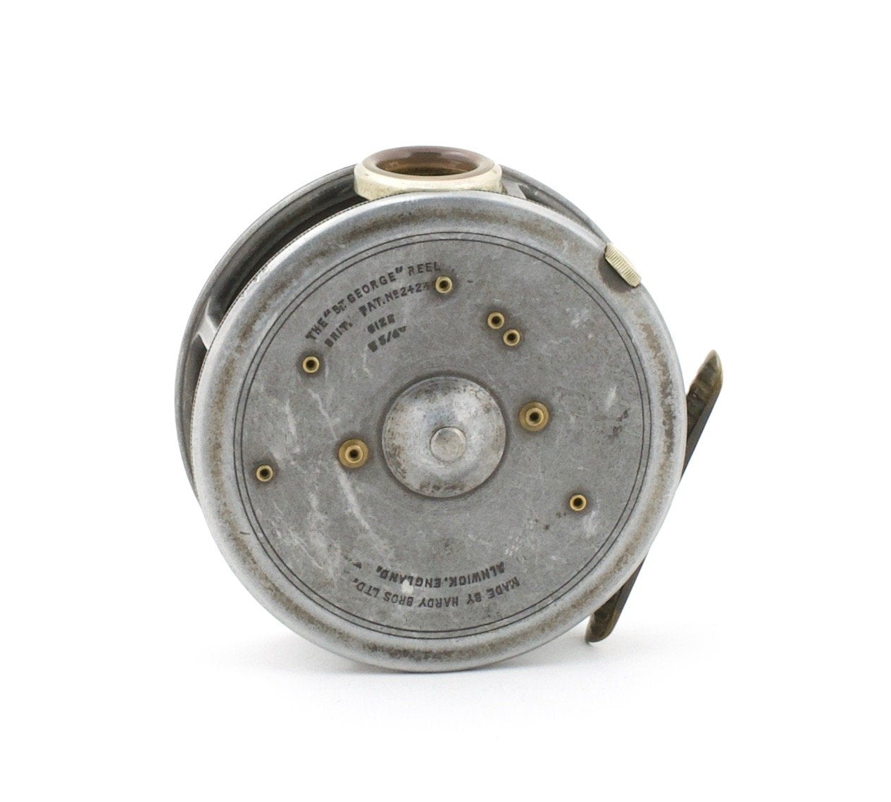 For sale here is a pre-WWII Hardy St. George 3 3/4" fly reel. Right-hand retrieve. Three-screw latch. Unblemished agate line guide. Full length and unaltered ribbed brass foot. Ebonite handle spins freely. Tensioner works perfectly. No line burns. No cracks or chips though there is some light wear to the rim from honest fishing use. Minor end play. Includes a handsome block leather case.