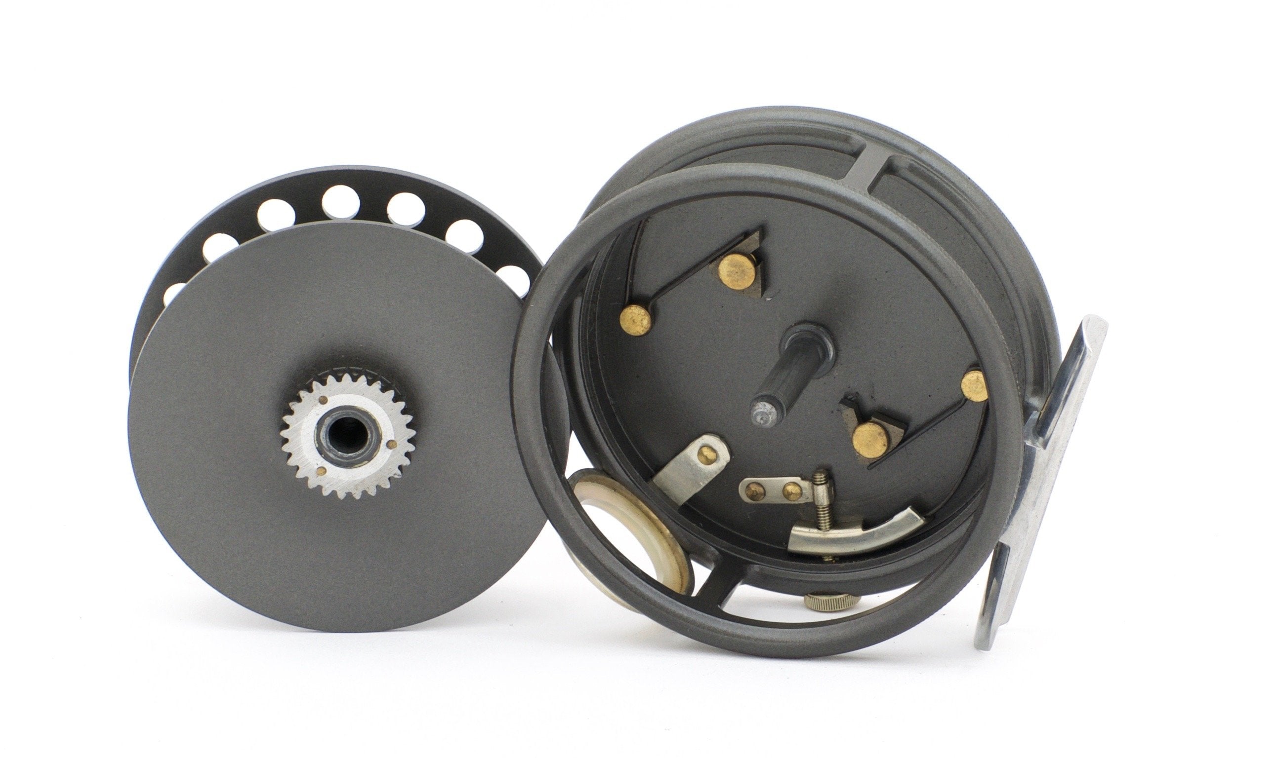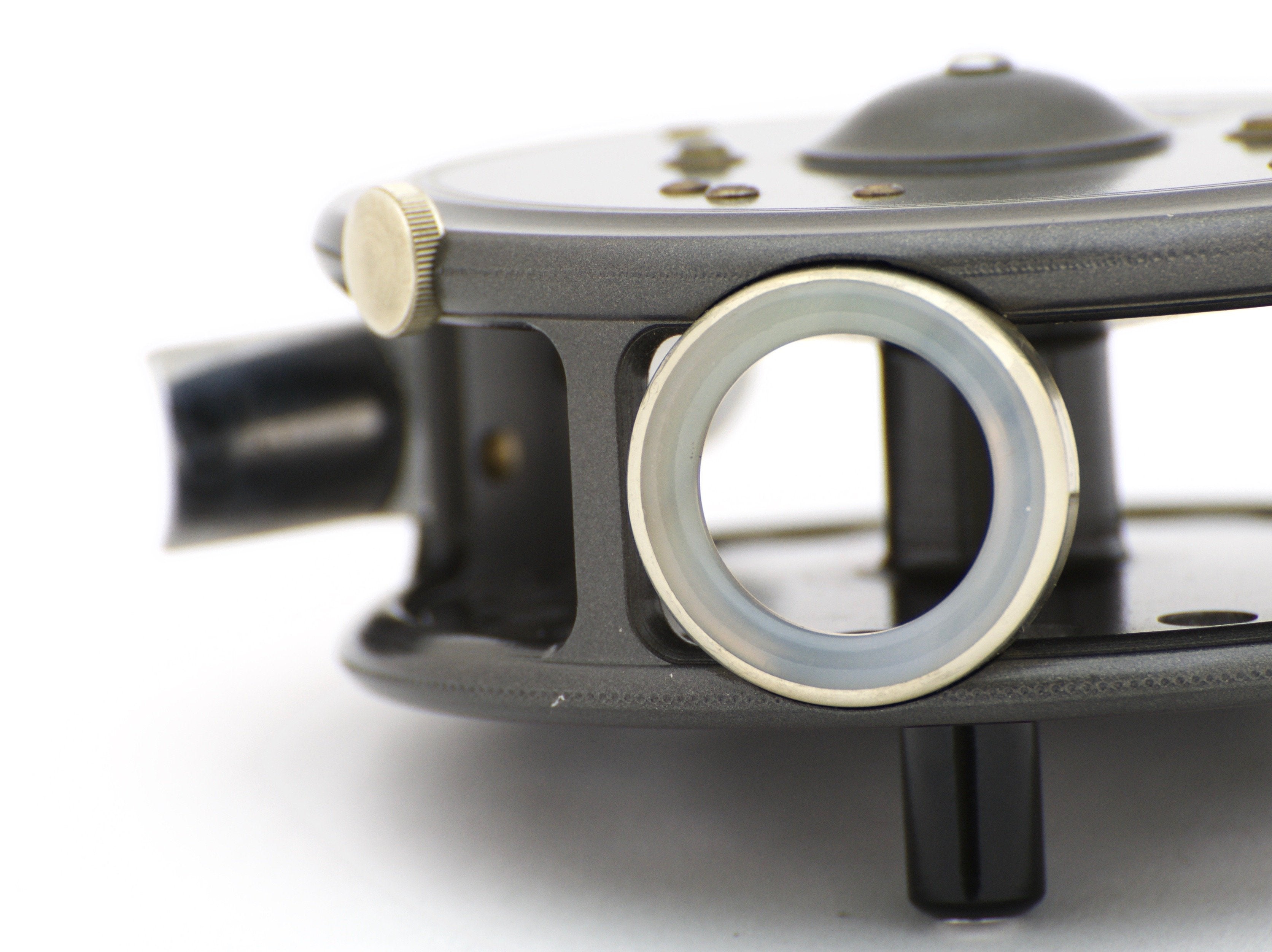 For sale here is a Hardy St. George 3 3/8" fly reel with two-screw latch. Unblemished agate line guide. Near mint condition. Unaltered smooth alloy foot and duplicated MKII check (both pawls engageable). The ebonite handle spins freely. The tension regulator works as intended. Nice strong check throughout its range. Comes with box and suede case.