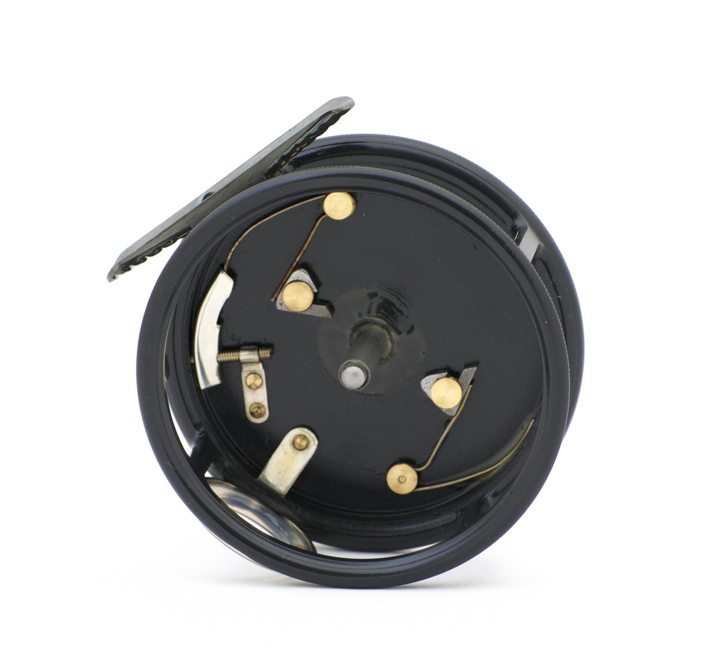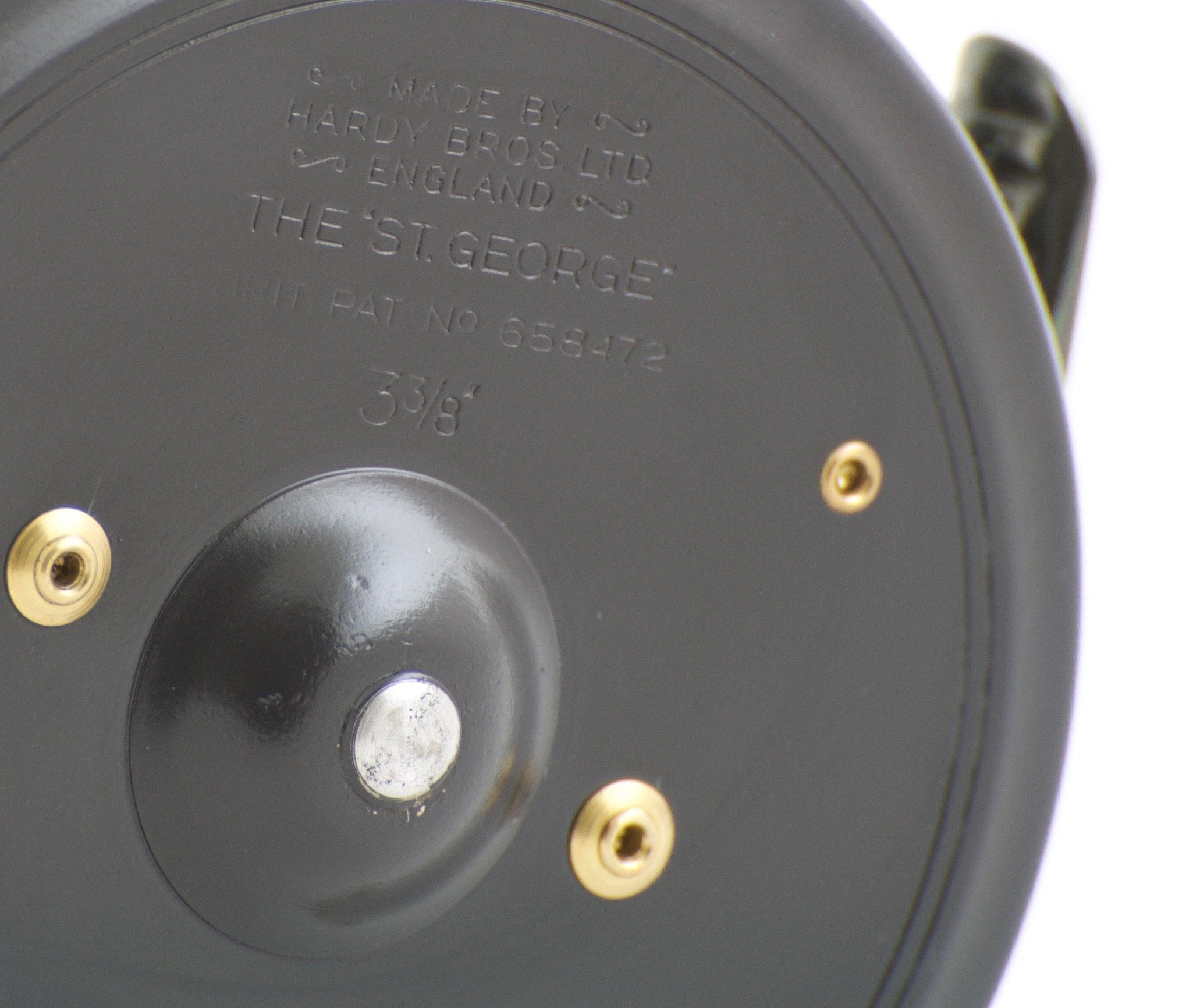 For sale here is a very scarce left-hand retrieve Hardy St. George 3 3/8" inch fly reel with two-screw latch. Excellent++ condition throughout. The reel was refinished (exterior finish) at Hardy's. Perfect ribbed brass foot. Duplicated MKII check. Perfect agate line guide but with some tarnish marks. Comes with zippered Hardy reel case.