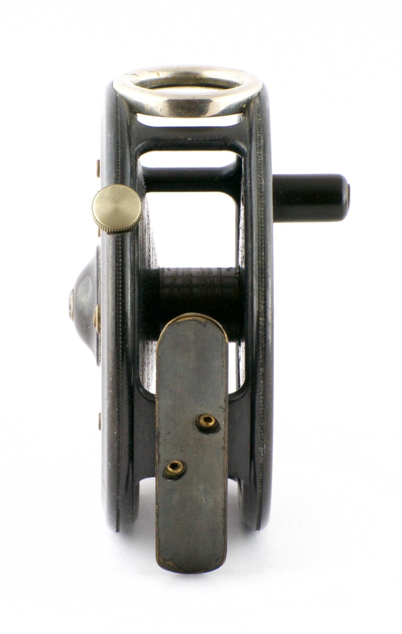 For sale here is a Hardy St. George fly reel with its original Hardy box. 3 3/8" diameter. Nickel silver lineguard (or monel?) All original and correct. Full length and unmolested ribbed brass foot. The ebonite handle spins freely. The tensioner works perfectly. Another collector-grade Hardy reel! Don't let it get away!