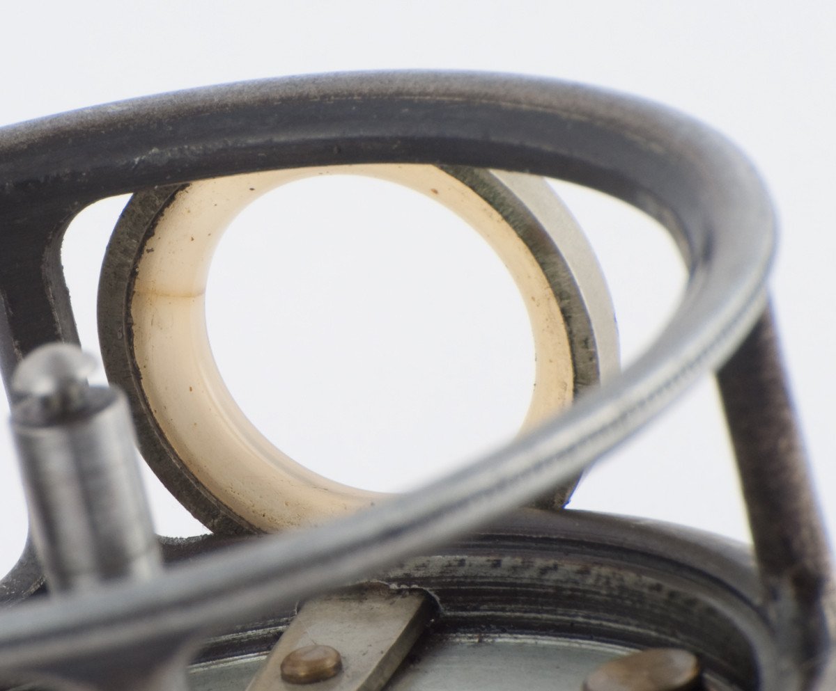 For sale here is a classic 3" Hardy St. George reel. Three-screw latch. Ebonite handle spins freely. No cracks, chips or dings. Nice amount of original leading on the reel. Pawls and gear teeth still in superb shape. Original ribbed brass foot is un-molested. Tension regulator works as intended. The agate line guide has one very slight hairline. Badged for Abercrombie & Fitch. A very nice example.