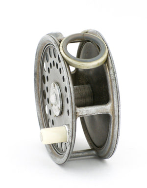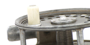 For sale here is a scarce three-rivet latch (not three-screw) Hardy St. George 3" fly reel with agate line guard. Excellent overall condition though it does show its age finish-wise. The Archuleta-replacement ivorine handle grasp spins freely. Both parts stamped "5". No mechanical issues to speak of. A really scarce version of the very popular St. George model.