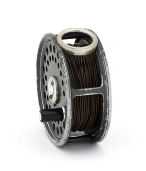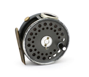 For sale here is a Hardy St. George reel - 3" diameter. Two screw latch. Right hand retrieve. Nickel silver or monel line guide. Full length ribbed brass foot. Mechanically excellent. Surface wear as shown. Comes with Hardy zippered reel case and a spare spool.