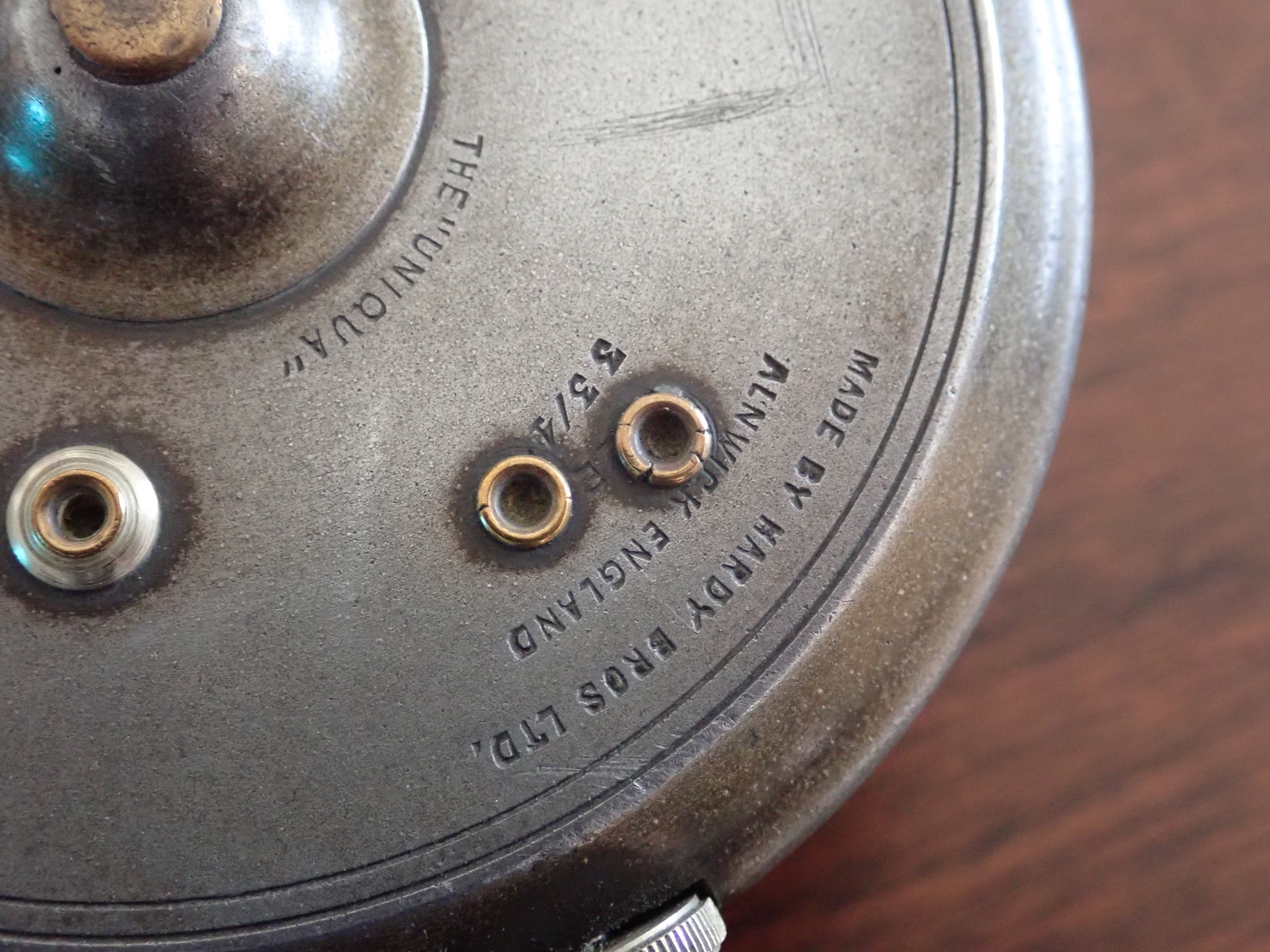 For sale here is a 3 3/4" Hardy Uniqua wide drum fly reel, badged for H&D Folsom Arms Co. Right hand retrieve. Duplicated MKII check. Excellent condition, both cosmetically and mechanically. No line grooves. The original ebonite handle spins freely. The tensioner works great. Gear teeth are in great shape with very sharp points. The reel weighs 10.50 oz. Original ribbed brass reel foot (straight and full-length) is 3 1/2" long. Spool width is 1 3/16". No wobble or end play of concern. Telephone latch functions as it should. No signs of repair whatsoever on this reel although it is missing the spare pawl.