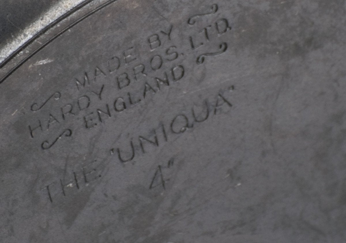 For sale here is a Hardy Uniqua wide drum reel, diameter 4". RHW. MKII check with spare non-engageable. It's in excellent shape, both cosmetically and mechanically. No line grooves. The original ebonite handle spins freely as it should. The tensioner on this reel works great. Gear teeth and dual pawls are in great shape with very sharp points. Frame has knurled edges. Reel weighs 12.4 oz. Original ribbed brass reel foot (straight and full-length). Spool width is 1 3/16". No wobble or end play of concern. Telephone latch functions as it should. No signs of repair whatsoever on this reel. Hard to find in this condition!
