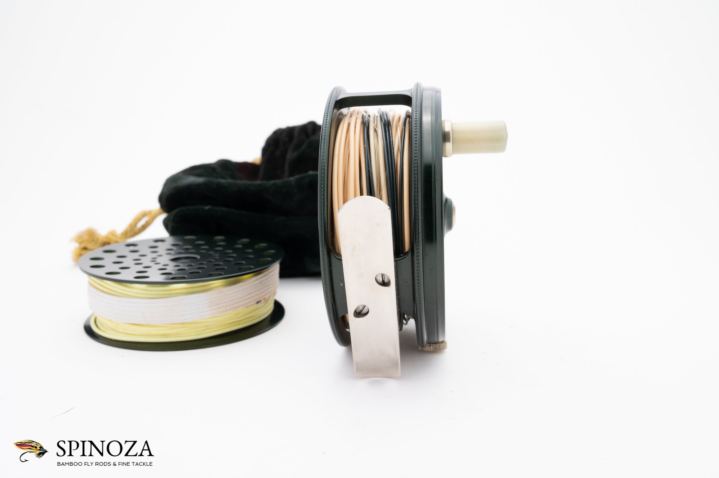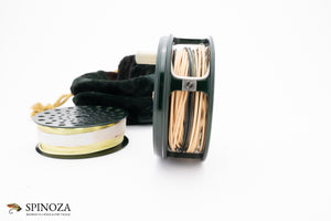 A nice Winston Perfect fly reel, 3 3/8" and set up for RHW. Made for Winston by Hardy, this reel has a a handsome finish with an almost forest green tint to it. Excellent+ condition overall with some very minor marks around the the frame edges but the crank plate and spool are nice and clean and no other signs of wear that I could find. Mechanically perfect. Serial number "WP2631" on the side of the foot. Spare spool has a line loaded on it but appears mint. Made for 6-7 lines. Reel and spare spool come in original velvet pouches with the Winston logo embroidered on them.
