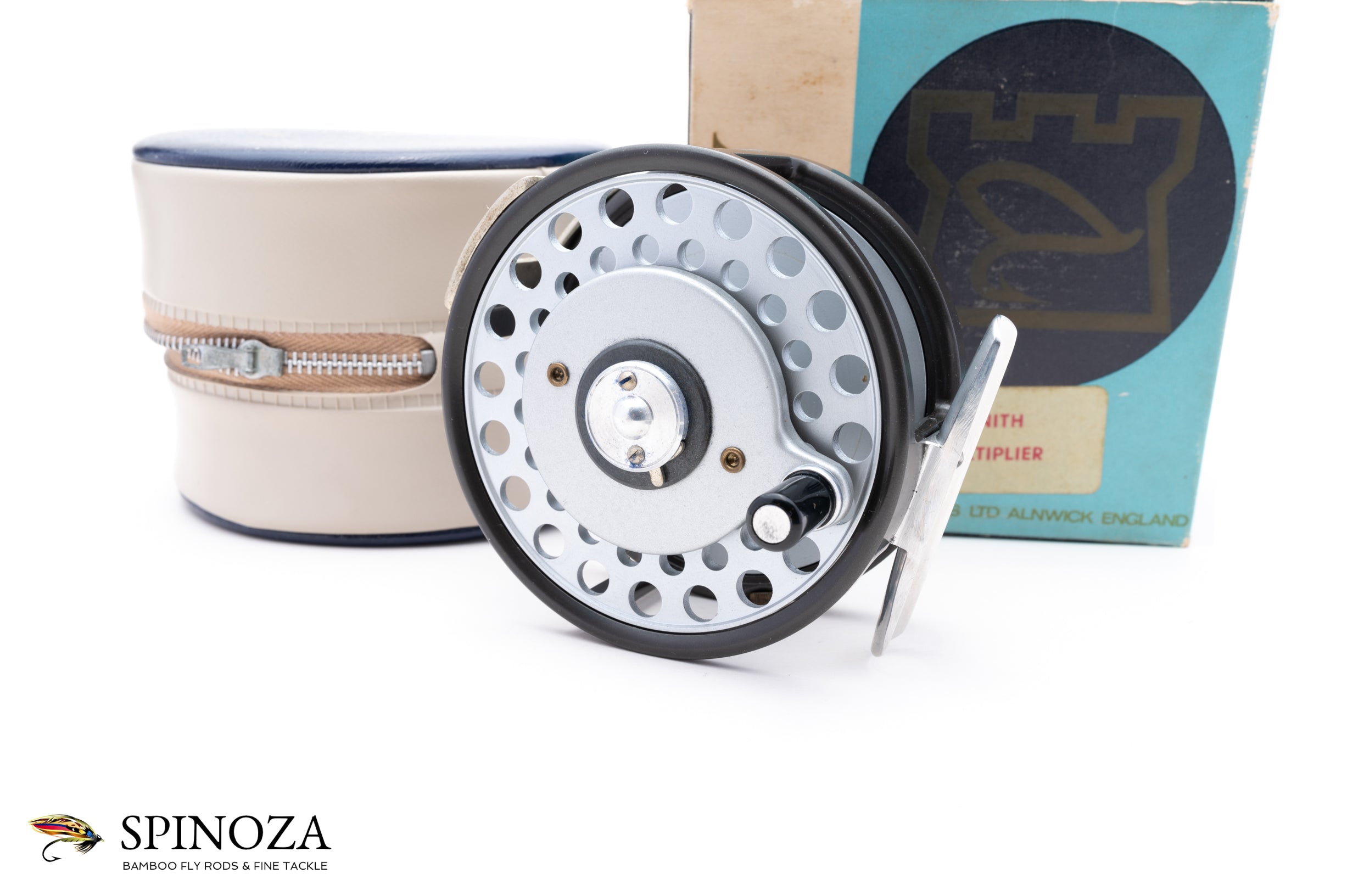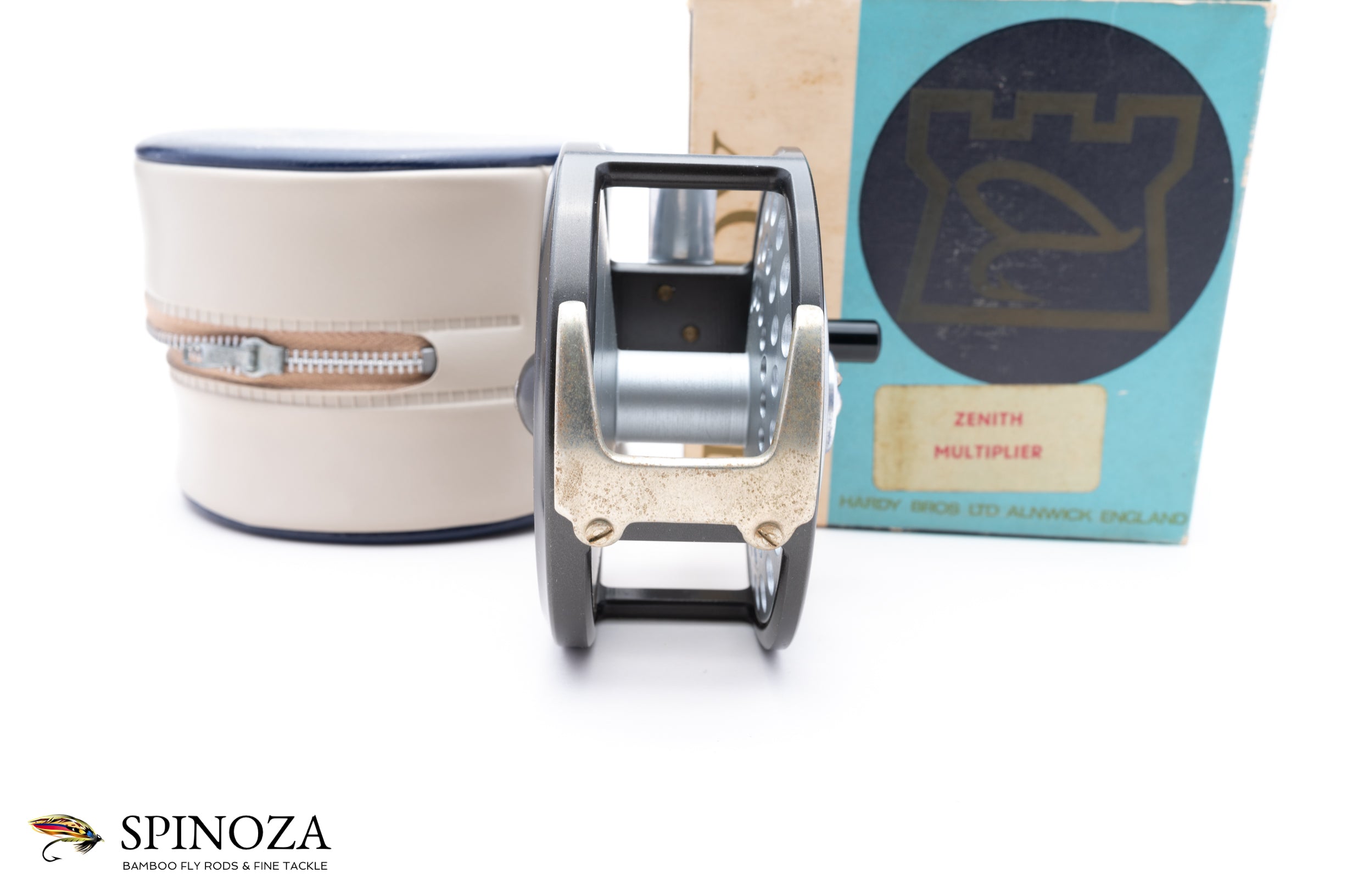 A rare Hardy Zenith Multiplier fly reel, 3 3/8" diameter and set up for LHW. The reel weighs 7.6 ounces on my scale. Near mint condition, with just the faintest hints of cosmetic wear here and there that indicate it has seen any use. Two screw nickel silver line guard. Dark grey frame with a lighter silver color spool. Alloy foot. A loud pleasing click with a multiplying retrieve. The reel packs into its original pouch with the Hardy pamphlet and the original Hardy box.