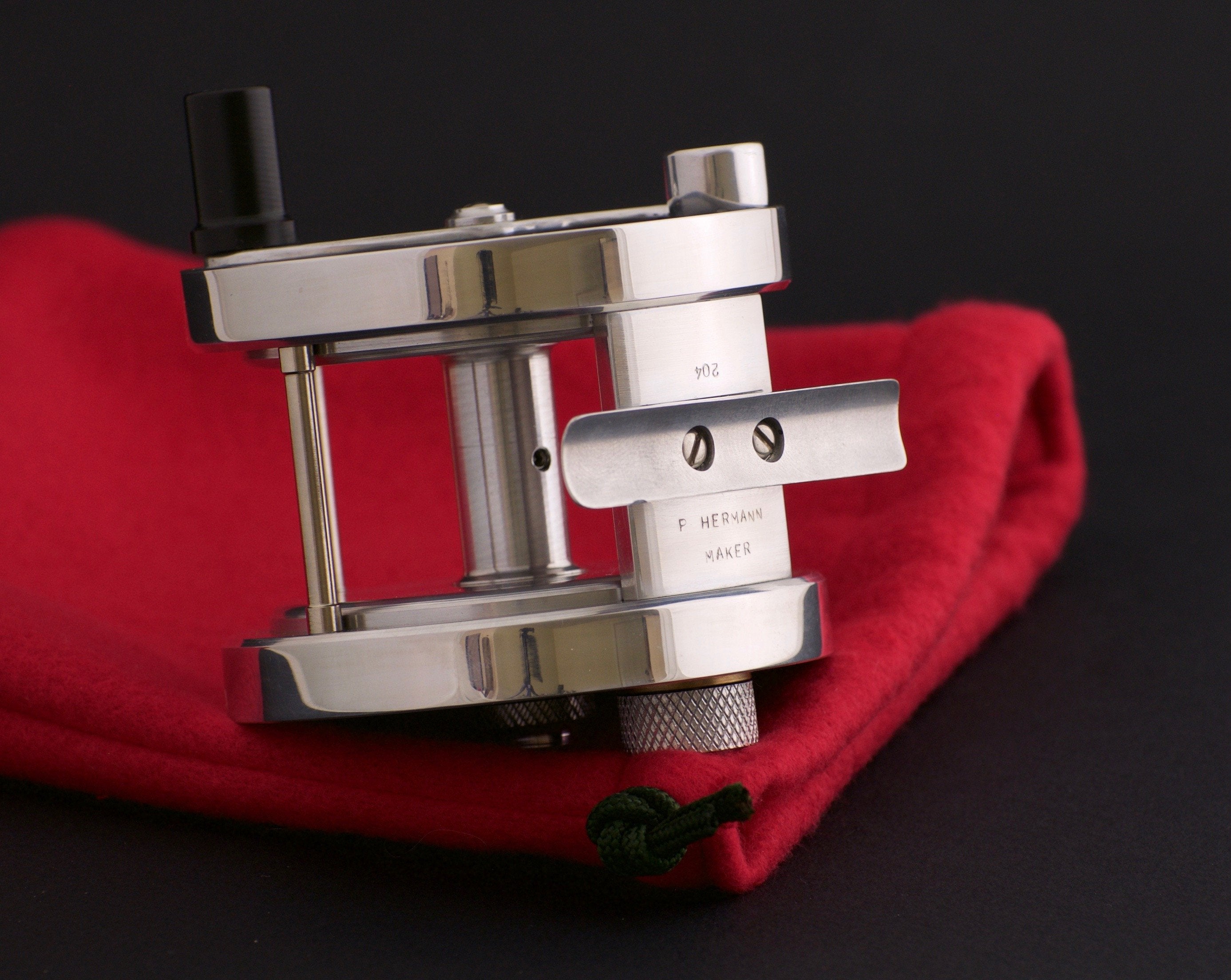 Simply another amazing piece of work by Dr. Hermann. If you ever have a chance to own one of these reels, you are very lucky. Dr. Hermann only made a little over 200 of these salmon models, a little over 100 Baby Hermanns, ~20 Large Trout Models and much fewer of the remaining two models, the Dry Fly Salmon and the Sea Trout. This reel is serial number204, one of the last reels made. There is a very slight indentation on the side of the reel foot that shouldn't interfere with its classification as a like new Hermann reel.