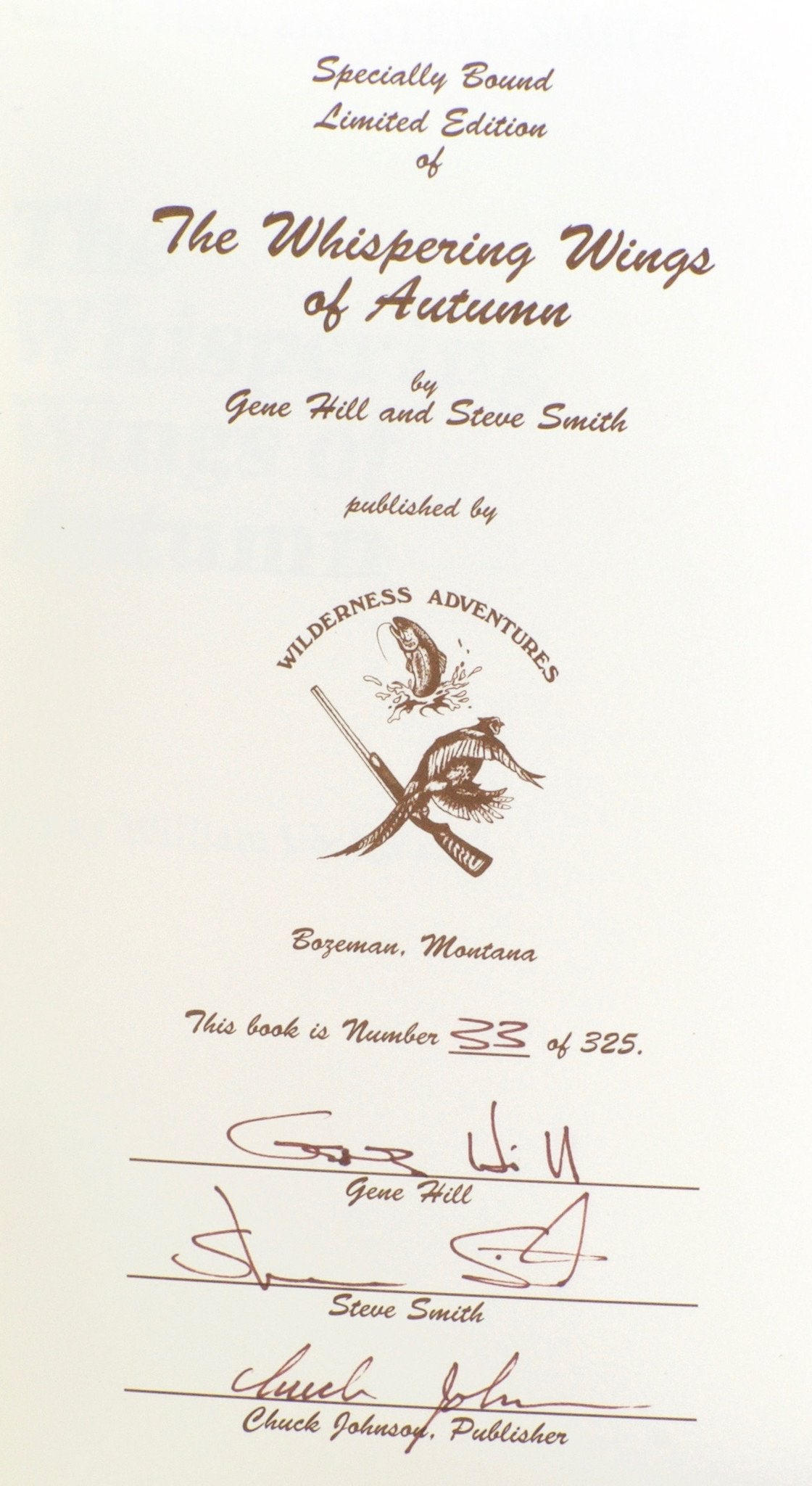 Wilderness Adventures Press, Gallatin Gateway MT, 1994. Hardcover. Book Condition: Fine. Schaldach, William (illustrator). First Edition, Third Printing. 168 pp. No. 33 of 250 copies. Size: 8vo - over 7¾" - 9¾" tall. Signed by Author & Publisher. Limited Edition.