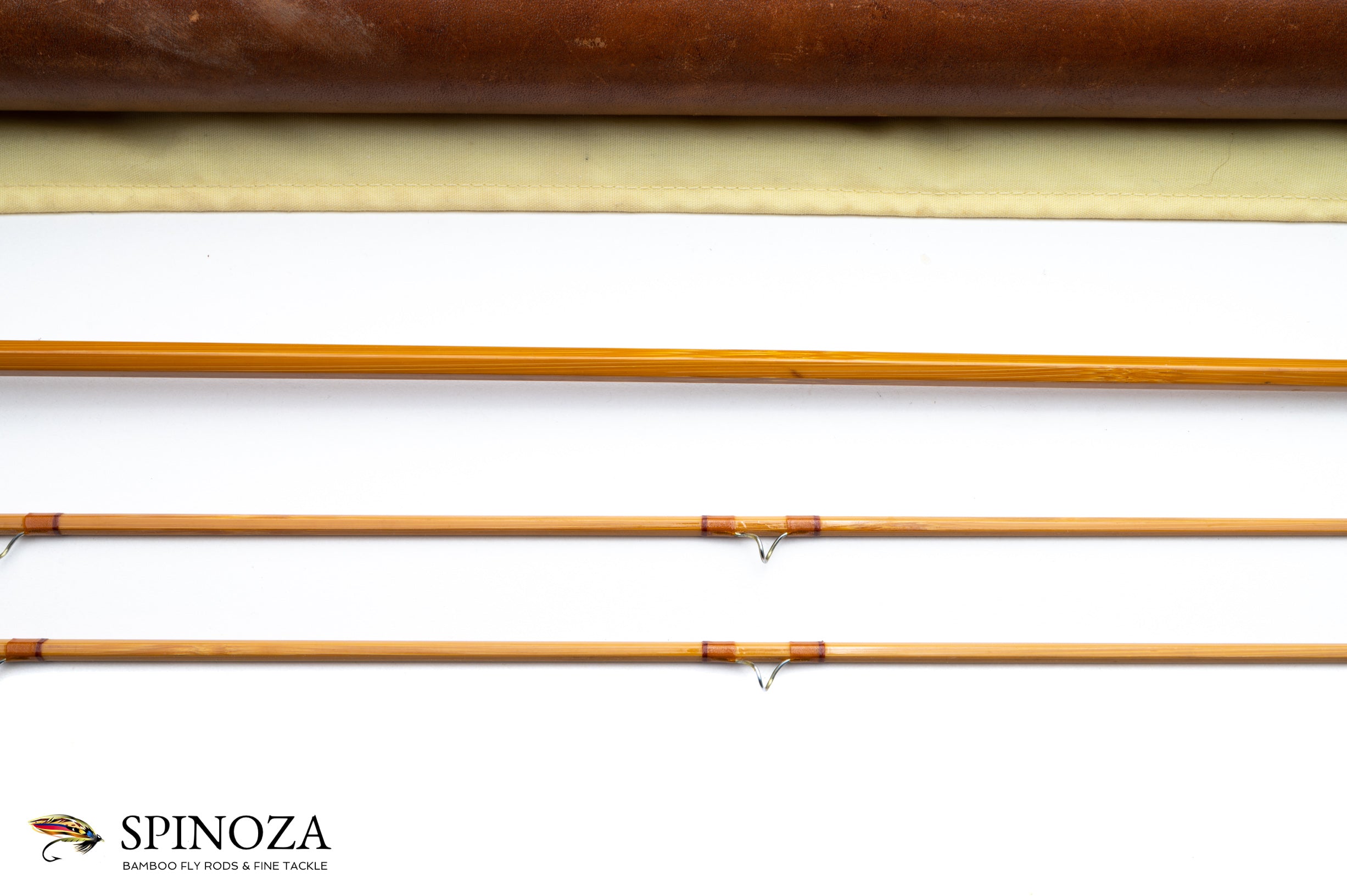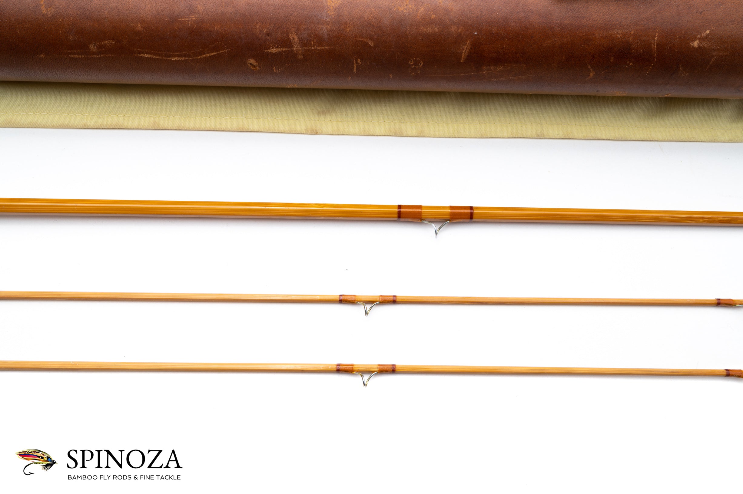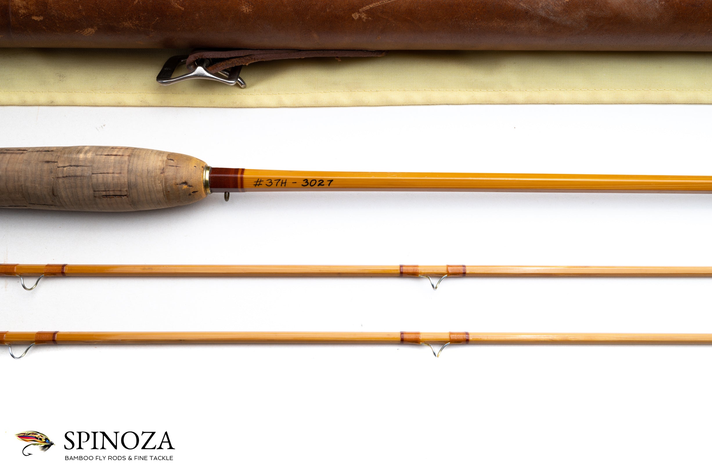 A Leonard model 37H bamboo fly rod, 6'6", 2-piece, 2-tip, and built for a #4 line. Serial #3027 which I believe puts this manufacture date around 1976. Weighs 3.4 on my scale. Modest use. Fast DF action. Varnished cane done in a three up node pattern. Brown main wraps with a band of tan and brown at the keeper and male ferrules. Ceramic stripper and chrome snake guides. The step ferrules are polished bright. The grip is 5" long and shaped to a western style with a hidden pocket cap. Polished aluminum uplocking screwlock with the roller die stamp "The Leonard Rod, HL Leonard Rod Co, Makers". The rod packs into a yellow poplin bag with a stiffener and an unbranded leather case with a bit of wear and tear.
