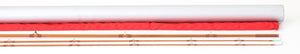 For sale here is a Gary Howells 8' 5wt 2/2 bamboo rod with a labeled weight of 3 3/4 oz. Serial no. 5017. The rod is in excellent+ original condition. All sections are full length and straight. Copper colored silks with gold trim. Ring hook-keeper. The cork grip has been cleaned and exhibits very slight ridging. Aluminum up-locking reel seat with a fine zebrawood spacer. Ferrule size 13/64, fit is nice and tight. The rod has a smooth medium-fast action, a bit quicker than many of Howells' tapers. The rod weighs 3 7/8 oz. Comes with original bag and labeled tube.
