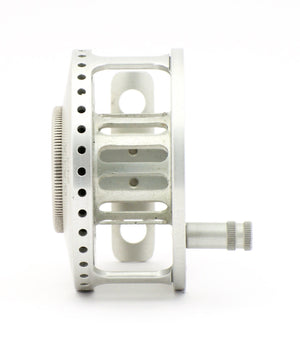 For sale here we have an Alex Kaplun made "GAIA" 4/5 fly reel, marketed by the Swedish company, Imago. Fully made in Europe. The reel is in near mint and very slightly used condition. No. 15 of 300 that were to be made - 150 of size 2/3 and 150 of size 4/5 (not certain how many were actually produced). Made out of D16T aircraft aluminum so it is very light, only 2.8 oz. Silky smooth click-drag brake system that allows you to fish with the most delicate of tippets and also has a neutral bias so you can fish right of left hand retrieve with equal performance. Exposed spool rim for easy palming. Medium sized arbor for quicker retrieve. Comes in a beautiful hand-made leather case with dark green felt lining.