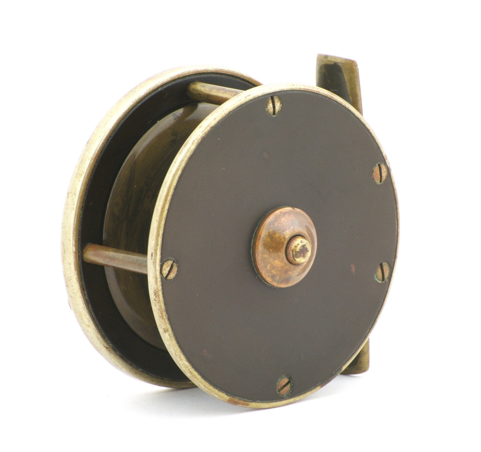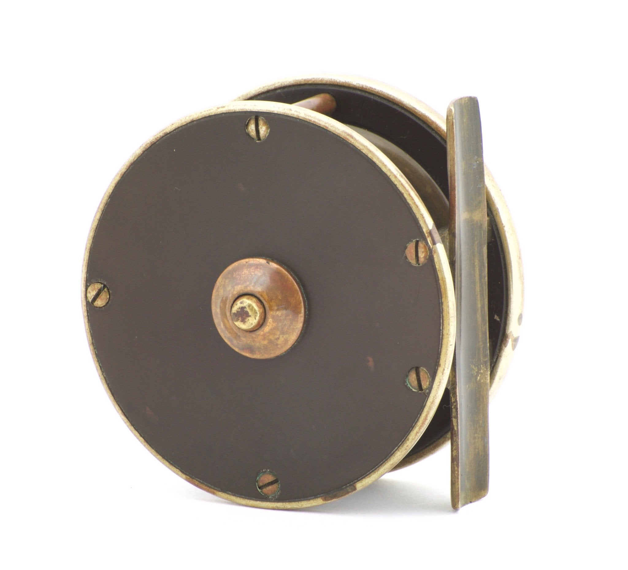 For sale here we have a James Ogden of Cheltenham Special Presentation ebonite, nickel silver, and brass platewind trout reel, circa 1900. 2 3/4" diameter, 7/8" spool width. The reel weighs 6 oz. In superb operating and cosmetic condition given its age. Nickel silver rims, bronze winding plate recessed inside the outer ebonite rings. No cracks in the ebonite. No apparent repairs. The clicker works great and there are no winding hitches. The fully intact horn handle spins freely. The reel foot is adequately straight and full-length. The screws are in excellent condition. Medium size arbor. The reel can be used right or left hand retrieve, with a neutral click bias being strong enough to prevent backlash. Intended for a 4 or 5 weight line and backing. The reel would look outstanding on an early bamboo rod, English or American! These early combination reels are extremely difficult to find in this condition.