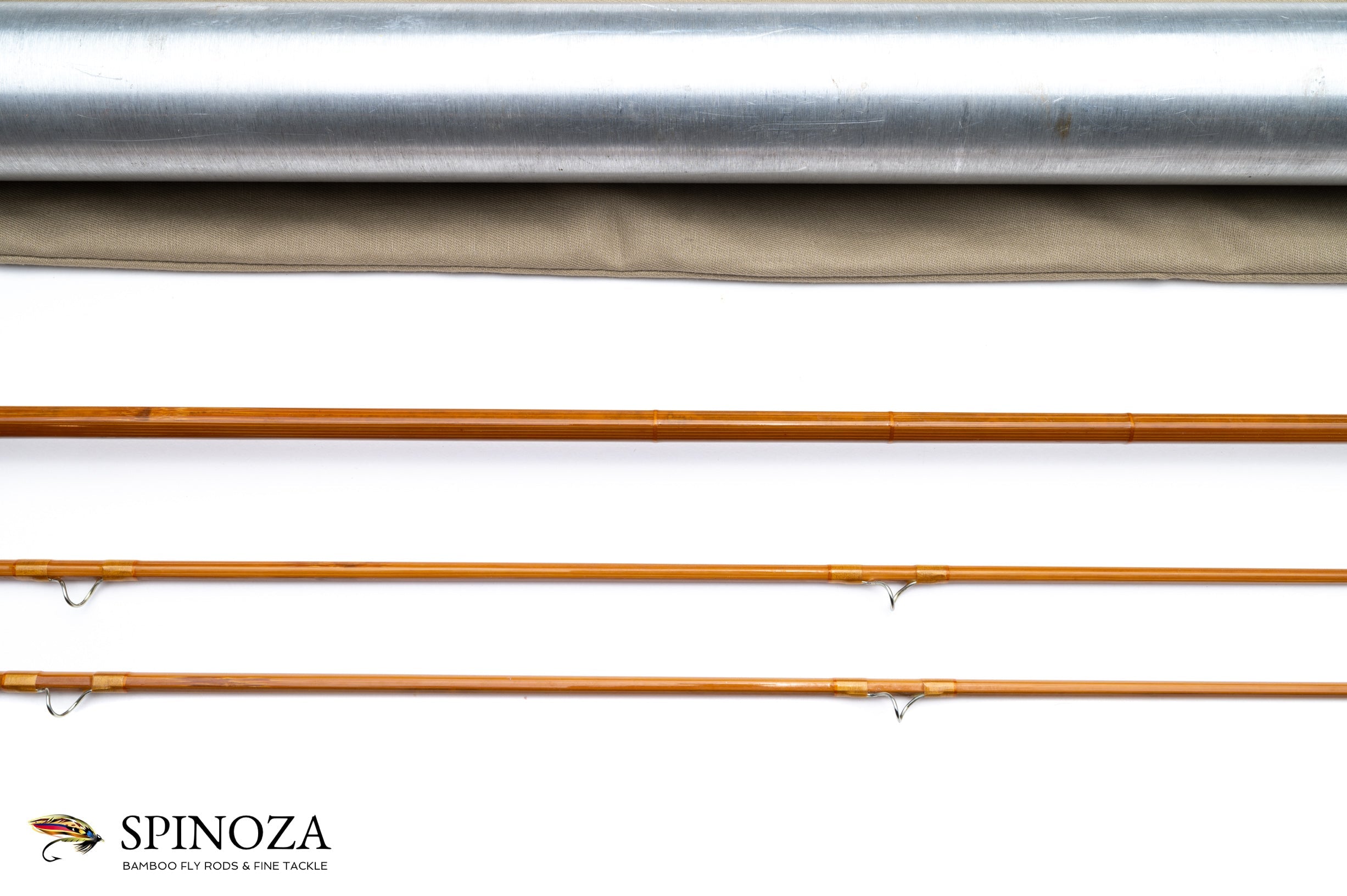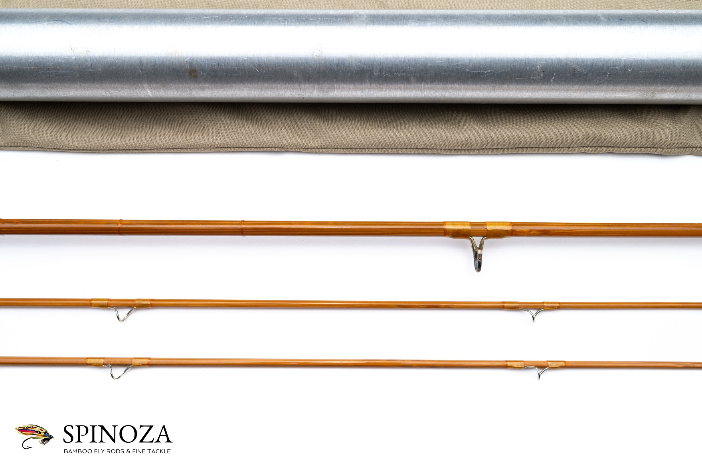 A nice John Bradford model 7313 bamboo fly rod, 7'3", 2-piece, 2-tips, and built for a #5. Serial number 1602. The rod weighs 4 ounces on my scale. A nice medium fast action. Lightly used condition, with some soiling to the grip and two small chips in the varnish on one tip, but the rod is in fine shape overall. Medium wheatstraw cane done in a three up node configuration. Wrapped in a light honey color with slightly darker honey tipping throughout, and the rod has three signature wraps between the keeper and the stripping guide. Carbide stripper with chrome snake guides and chrome tip tops. The ferrules are oxidized with the oxidation remaining very nicely intact. The grip is 6 1/2" and shaped to a medium cigar. The reel seat is a polished bright downlocking slide band over a light stabilized wood spacer. The makers mark has been stamped into the butt cap on the reverse side of the pocket. The rod packs into a tan cloth bag with the rod's hang tag in place and a brushed aluminum tube with brass fittings and the maker's data sticker affixed to it.