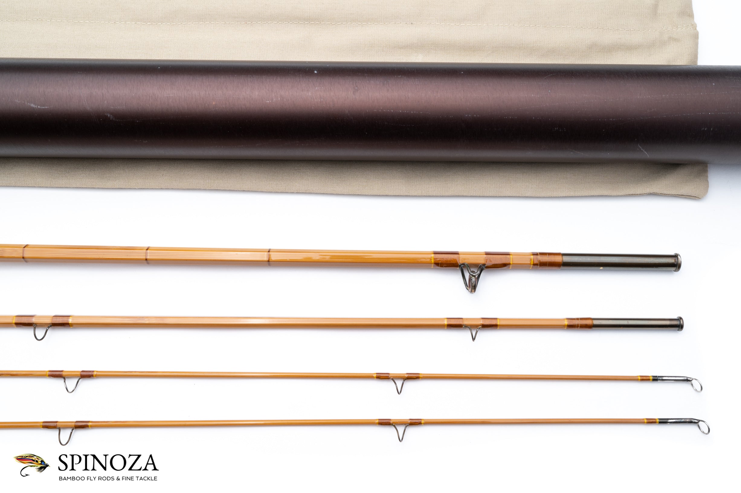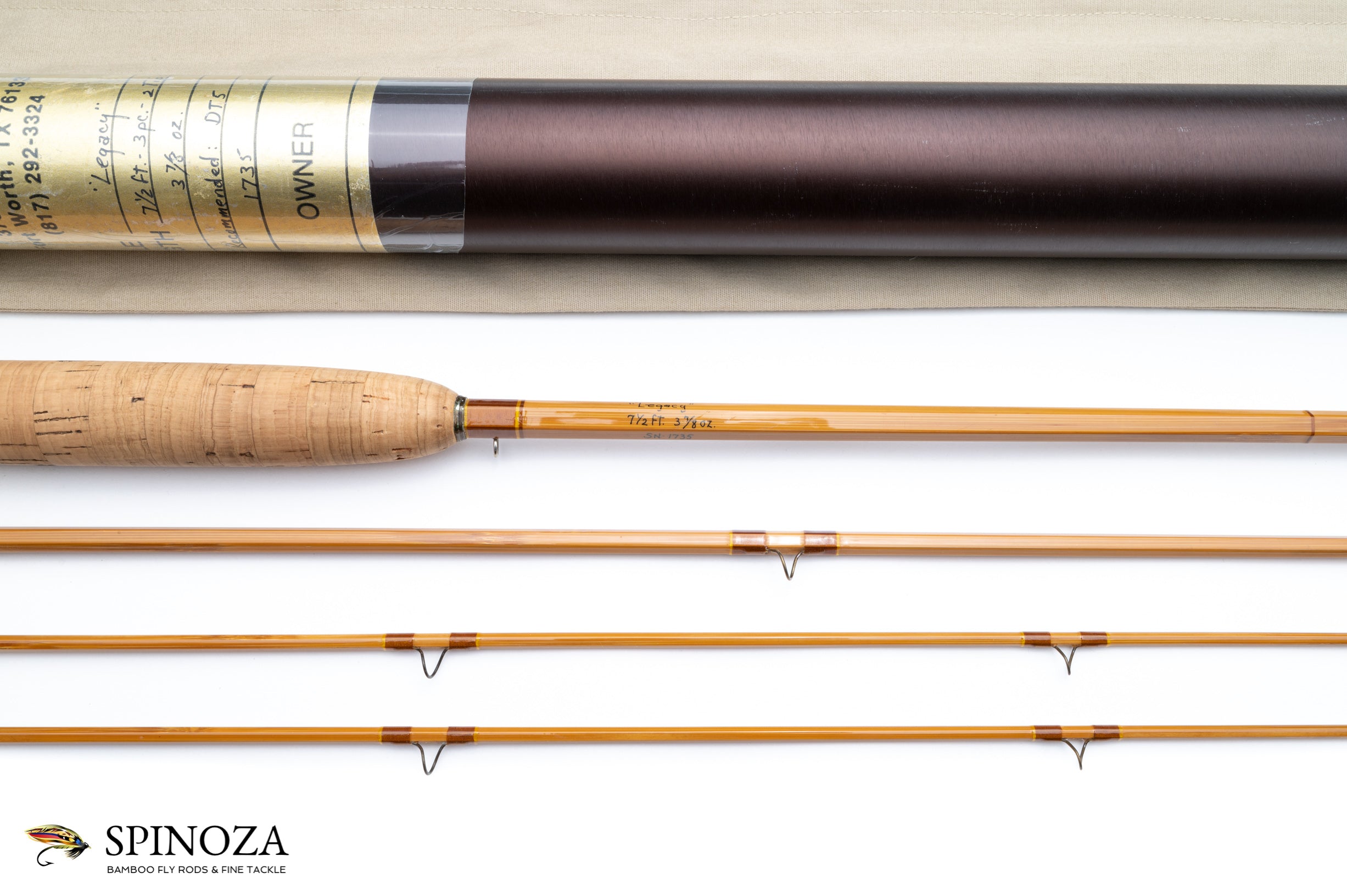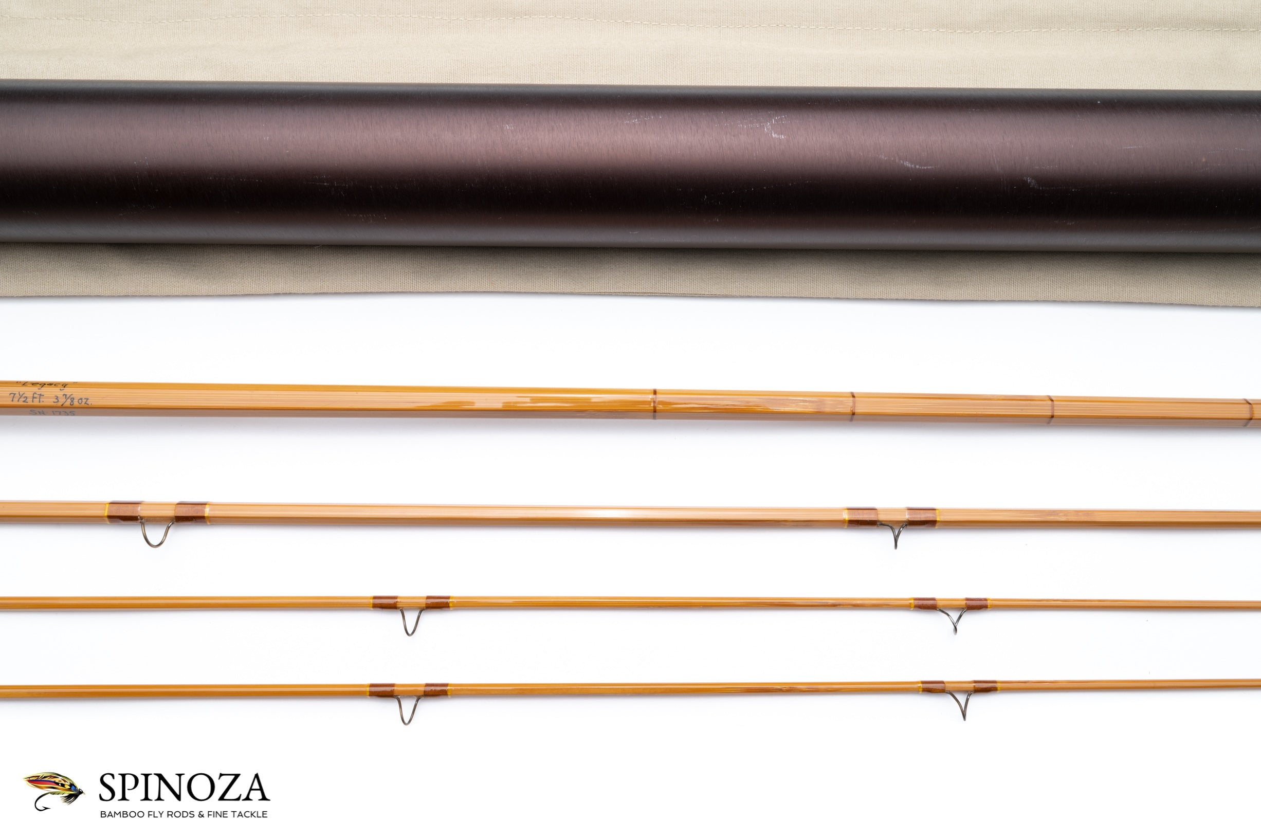 A John Bradford "Legacy" model fly rod, 7'6". 3-piece, 2 tips, built for a #5 line. A rare model that's hard to come by. A nice medium-fast progressive action. Excellent, lightly used condition. "J.A. Bradford Maker, "Legacy", 7 1/2 ft 3 7/8 oz., SN 1735" inked on successive flats on the butt. The rod is straight and the ferrule fits are nice and smooth. Medium wheatstraw colored cane in a spiral node configuration. Nice varnish throughout. Wrapped light brown with gold tipping at the keeper, ferrules, and tip-tops. Step ferrules with a slightly coppery oxidized finish. Agate stripping guide. Medium cigar cork grip that's 6 3/8" in length. Light cap and ring oxidized hardware that has some mild brassing to it. The cap has a small crack down one side though the cap isn't loose in any way. "JA Bradford Co, Maker" stamped in a cartouche on the cap. The rod comes packed in a khaki bag with two brass and cork ferrule plugs attached to a tie at the top, and a dark copper/plum colored anodized aluminum tube with brass fittings. The tube has John's data sticker attached to it.