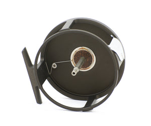For sale here is a scarce fly reel made by Ole Jørgensen in Denmark. This is his Condor model, 3 5/8" diameter, 1 3/8" spool width, 11 1/2 oz. with backing. Right hand retrieve. Excellent+ condition. Adjustable cork disc drag - very strong.