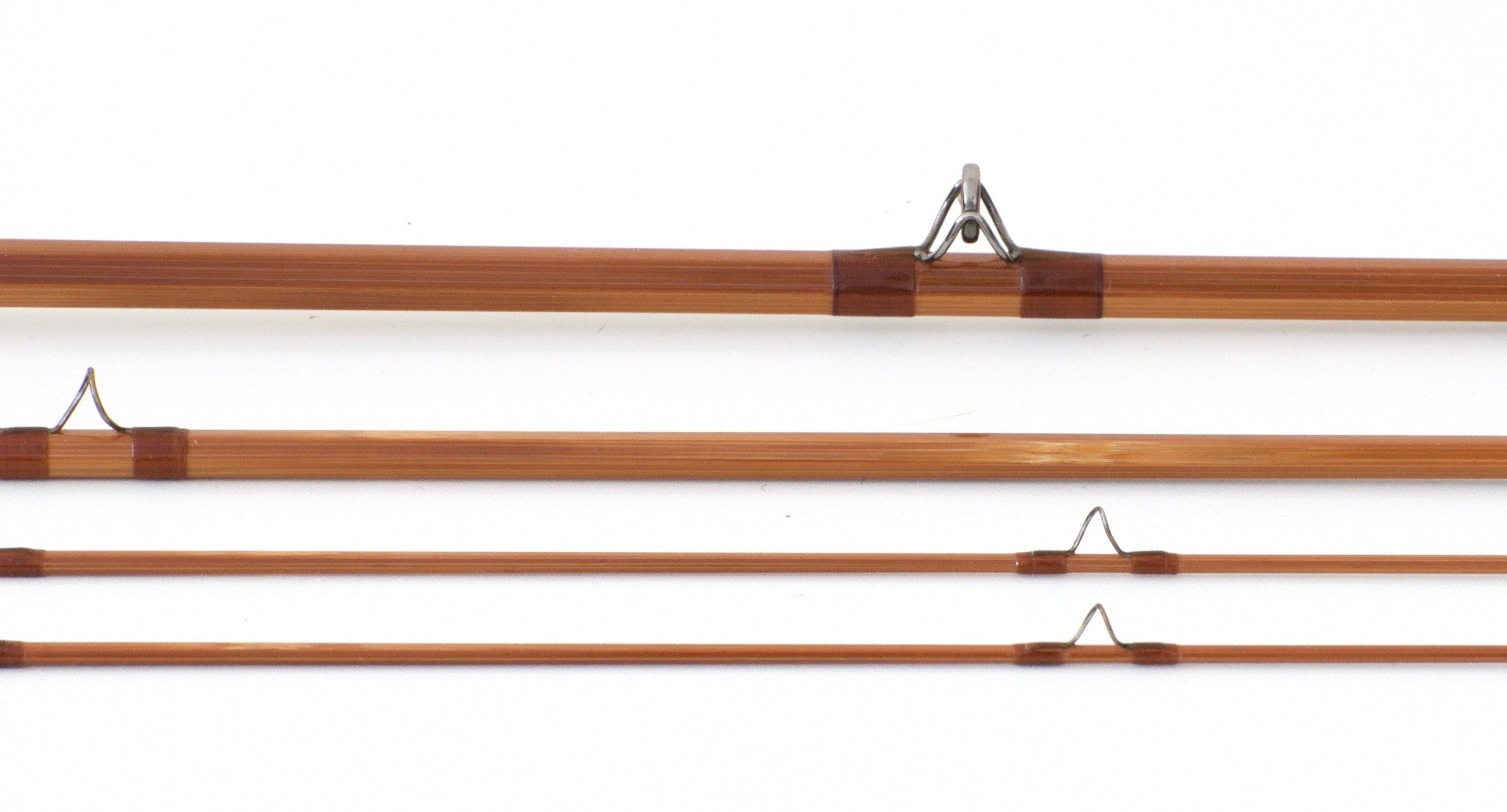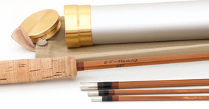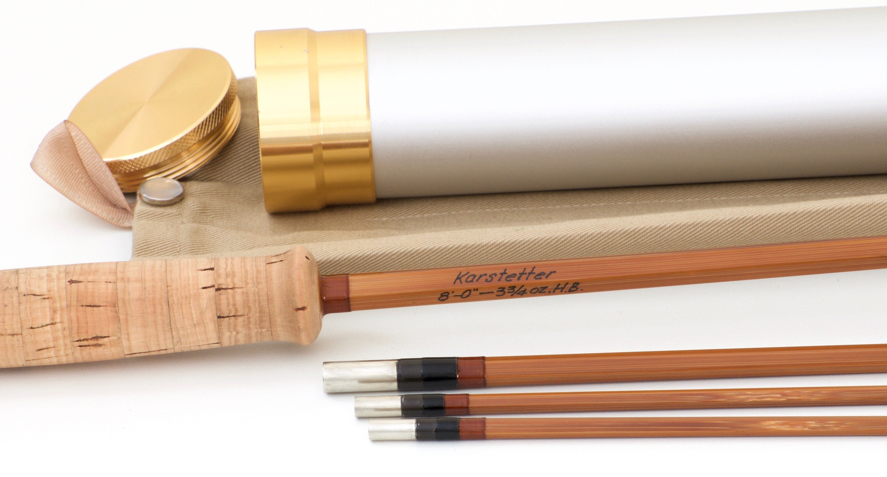 For sale here is a Marty Karstetter hollow-built bamboo rod - 8' 3/2 for a 5 weight line. 3 3/4 oz. Serial no. 16911. The rod is in excellent condition. All sections are full length and straight. Marty makes some of the finest casting rods on the planet currently and we've always sold them immediately due to their popularity. We rarely see them on the secondary market because their owners admire them so much! This rod was made in 2011. Moderately tempered cane, varnished, agate stripping guide. Powell-style Wells grip with light soiling, void of any defect. Oxidized cap and ring reel seat over a beautifully figured wood spacer, there is a bit of wear to the bluing around the bottom rim of the butt cap. Oxidized swiss-syle truncated ferrules size 11/64 and 17/64, the fit is perfect. There is light wear to the bluing on the mid-section female ferrule. Swift and powerful medium-fast action also capable of delicate casts and great tippet protection thanks to the thin tips. Includes original bag and tube with brass fittings. You will not be disappointed!