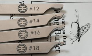 For sale here is a set of stainless steel wing burners in sizes #12, #14, #16 and #18 for tying the standard Iwamasa Duns and No Hackle patterns.