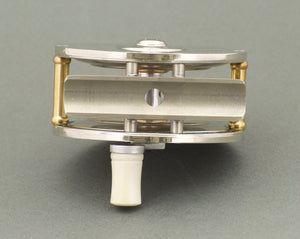 For sale here is another very rare Kineya special prototype reel - a Model 200 made from nickel silver - the 200Ni. This is a limited edition reel - one of four Mr. Okui has made like it, so this is a good chance to acquire a very rare item from Kineya. Frame, spool, foot, shaft and screws are nickel silver. Handle arm is aluminum. Pillars are brass. Handle is ivory. If you look closely, you can find two inserts made of sapphire on this reel. Mass made two of these reels with blue sapphire inserts and two with red sapphire inserts. Very nice touch from a true master of his trade. Perfect for a 3 or 4 weight line. This reel is unused. Setup for LHW. Comes with original Kineya suede drawstring reel bag.