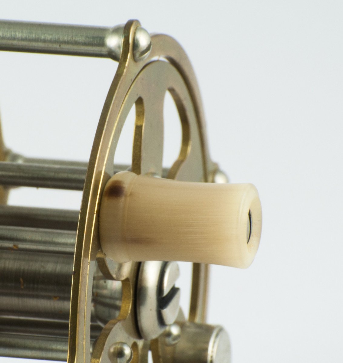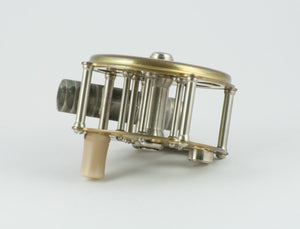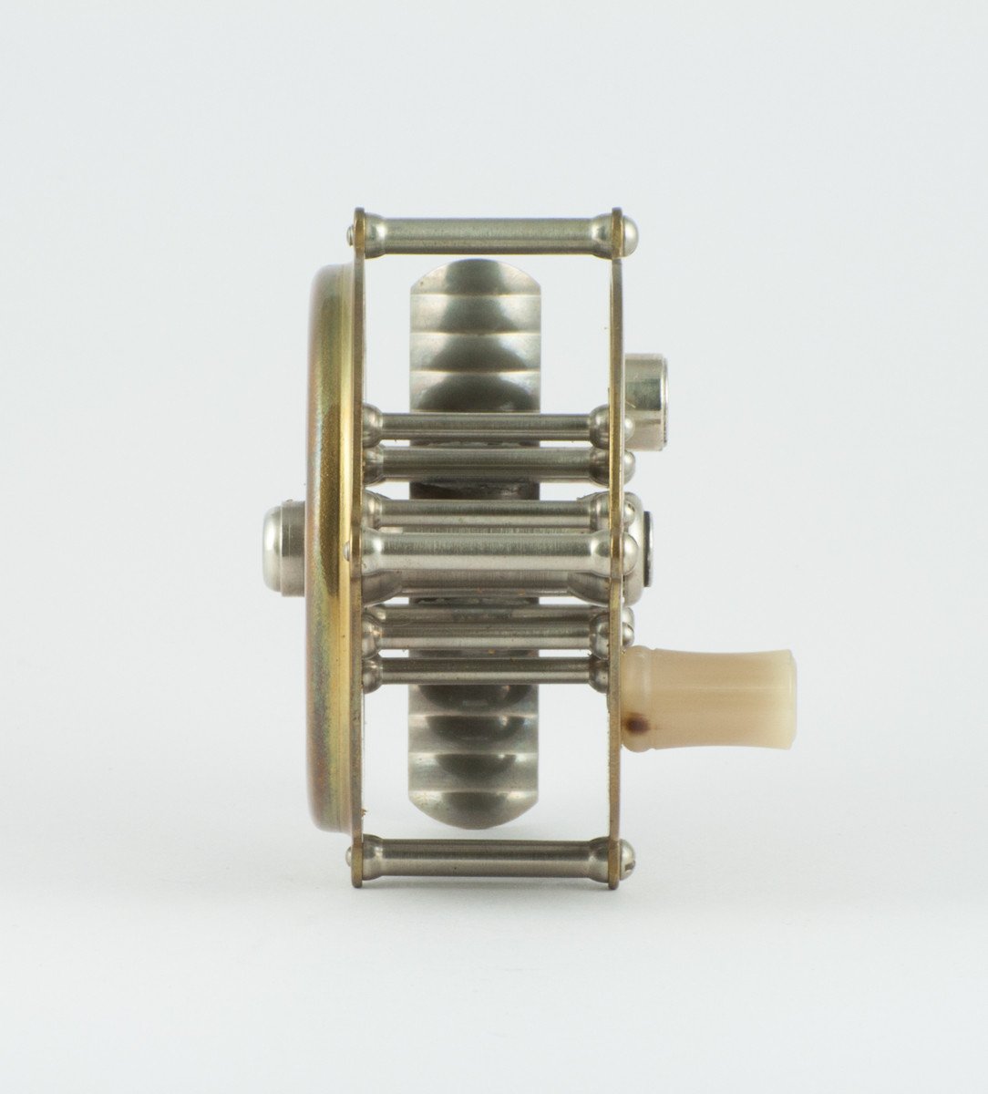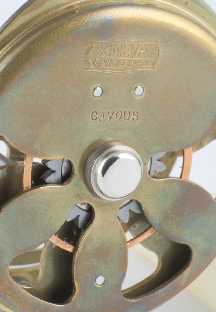 For sale here is a wonderful little Kineya Cavous Reel in brass finish with nickel silver pillars and screw fittings. Reel diameter is 62mm or 2.44". Spool width is 25.4mm or 1" This is a fixed check reel and the line capacity is a DT3 with 30 yds of backing or a DT4 without backing. This reel is in unused, original condition. Comes with original Kineya suede drawstring reel bag and box. Another awesome small stream reel that looks outstanding on bamboo or glass rods!