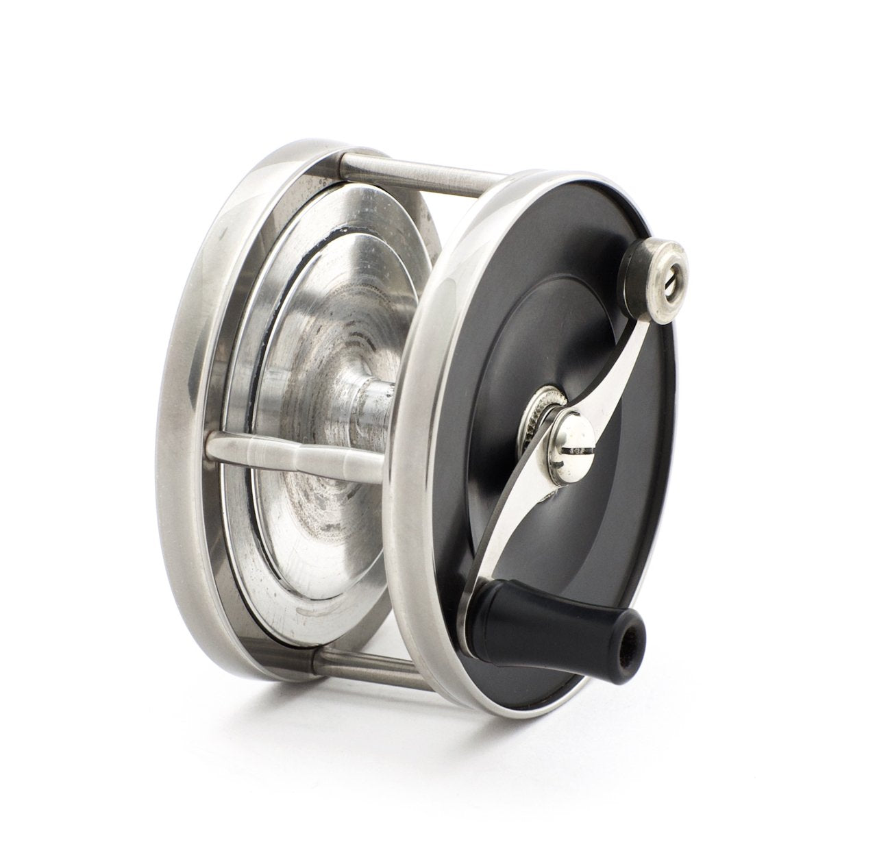 For sale here is a beautiful Kineya Model 702 fly reel in little-used condition. Stainless steel rims and pillars. Counterbalance and rear cap are nickel silver. This reel was a prototype and includes a fixed check system unlike most other model 702s which had the adjustable drag system called the Stag Beetle. Diameter is 3", spool width is 1" and holds a DT5+120 or DT6+80. Reel weighs 6 oz. Set up for LHW.