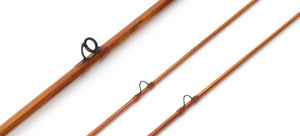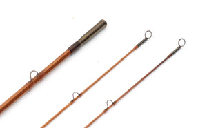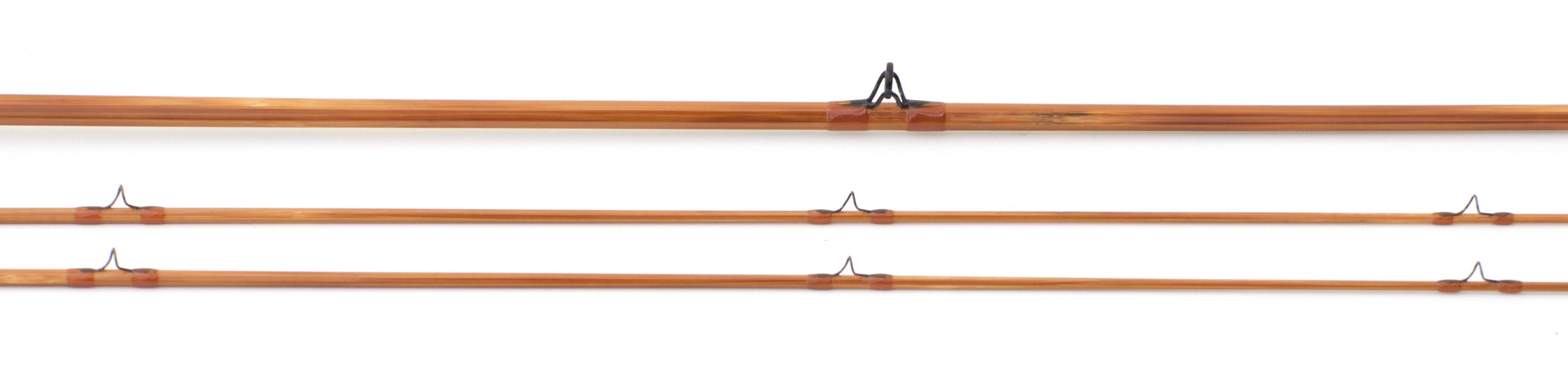 The ferrules are size 13/64 with a perfect fit. The rod weighs in at 3.30 oz. The action is on the fast side of medium-fast. The rod includes the original bag with hang-tag and stiffening dowel and original tube with brass fittings.